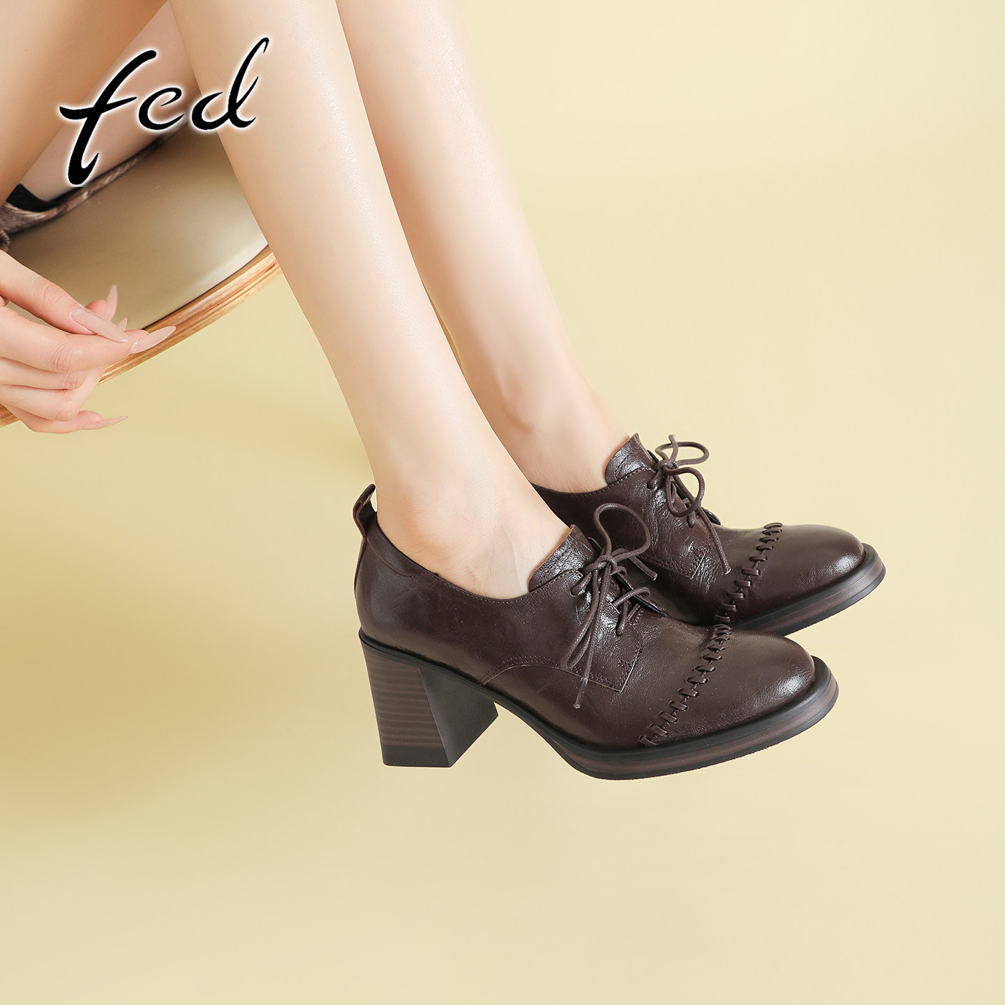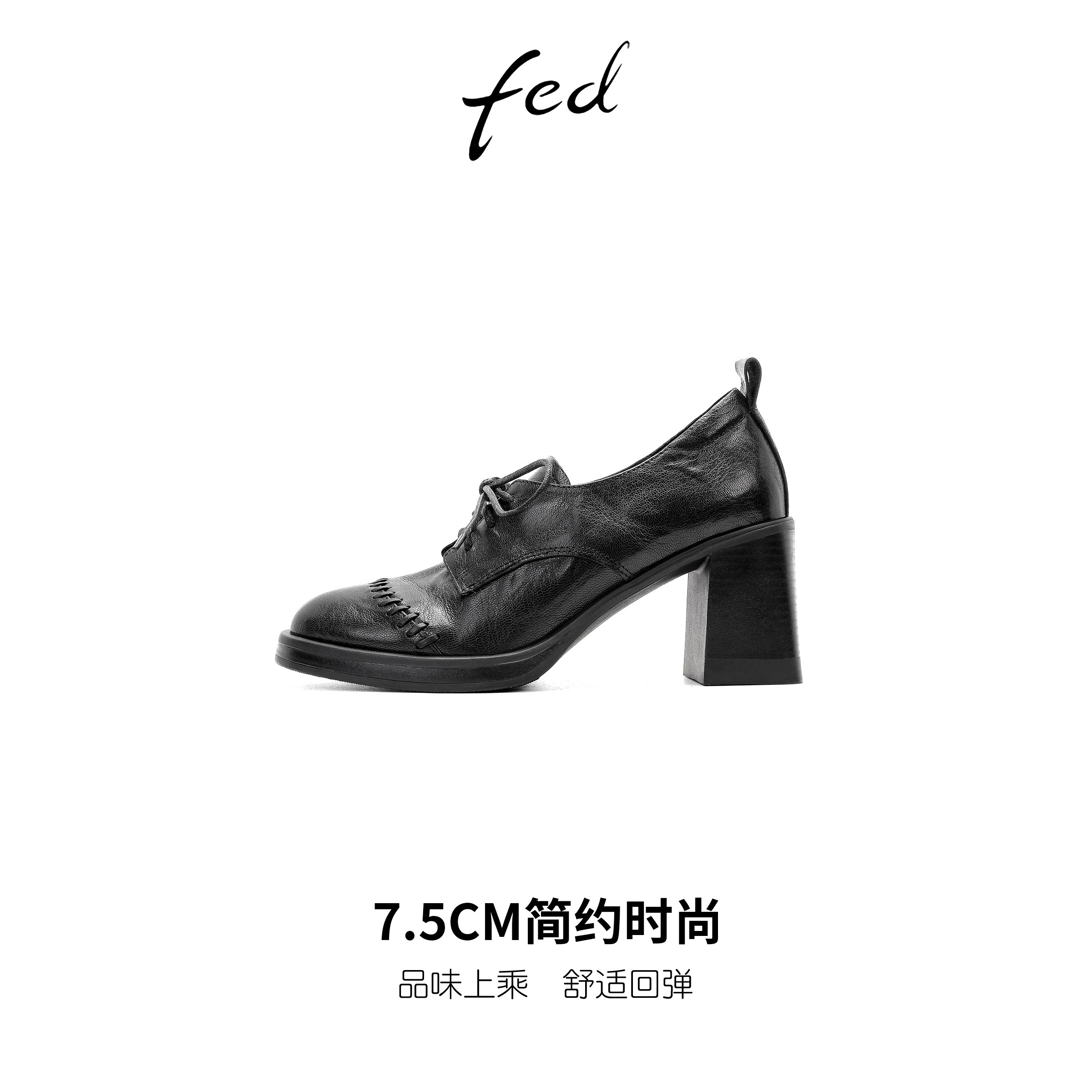 fed英伦风真皮粗跟乐福鞋女复古系带小皮鞋气质圆头高跟深口单鞋