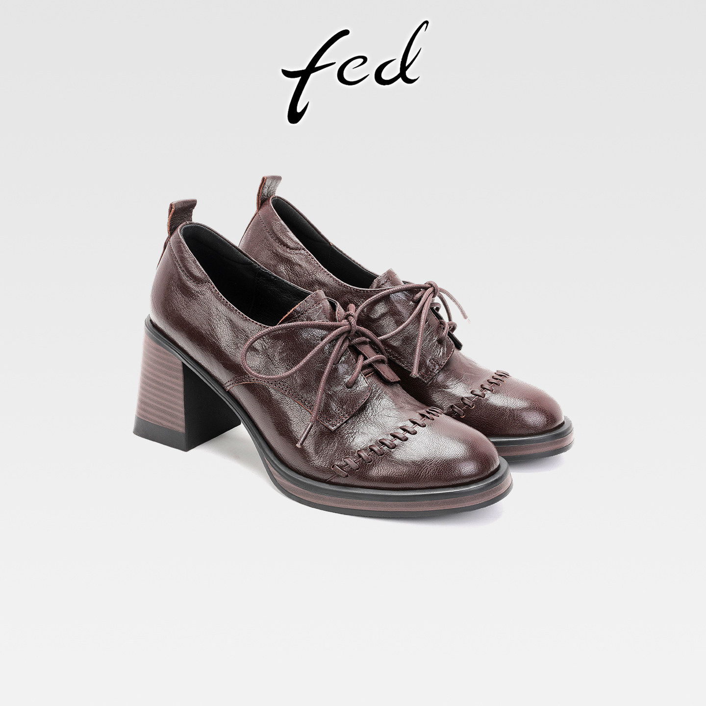 fed复古系带小皮鞋圆头高跟单鞋