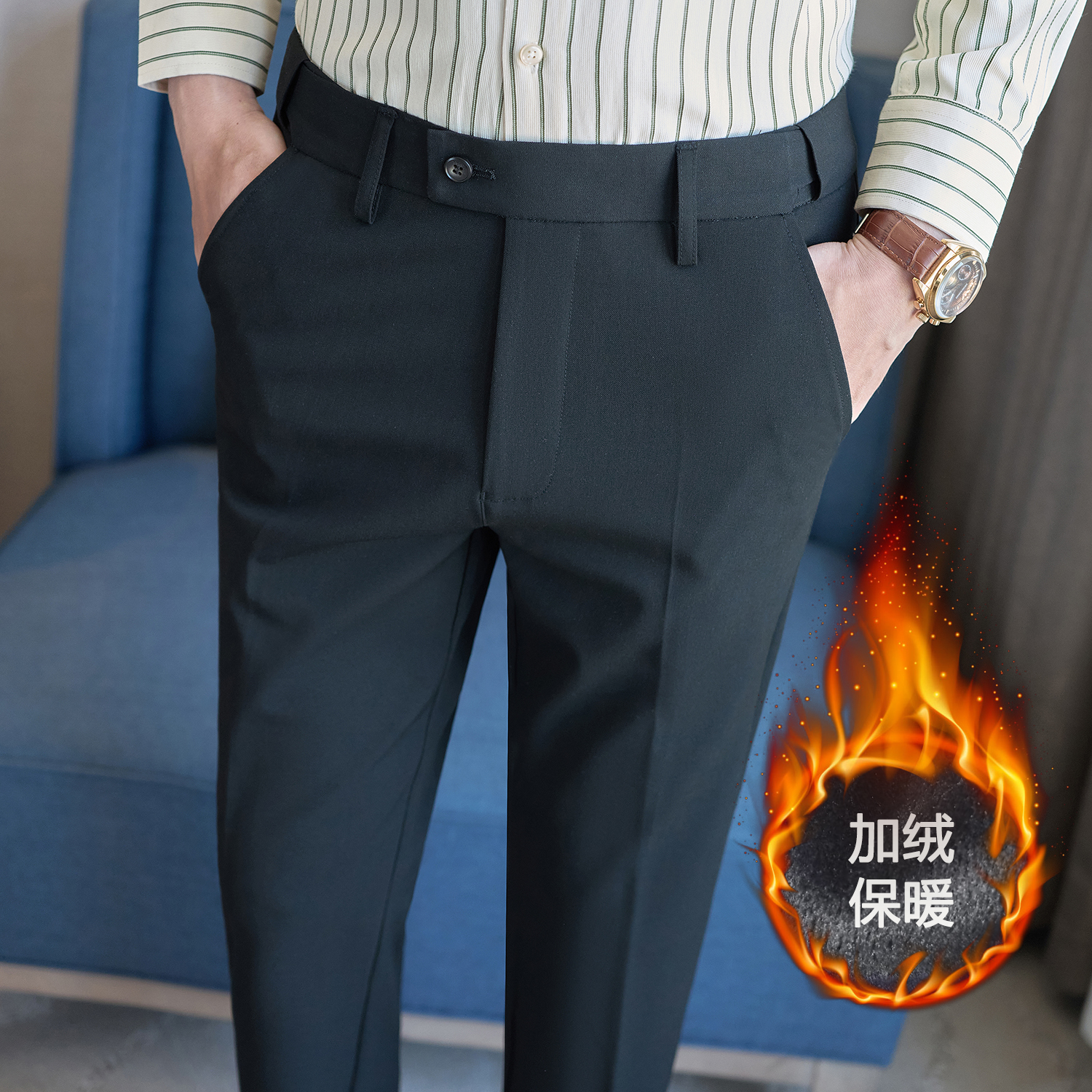冬款潮男裤子加厚加绒保暖9分西裤伸缩腰九分裤修身直筒休闲西裤