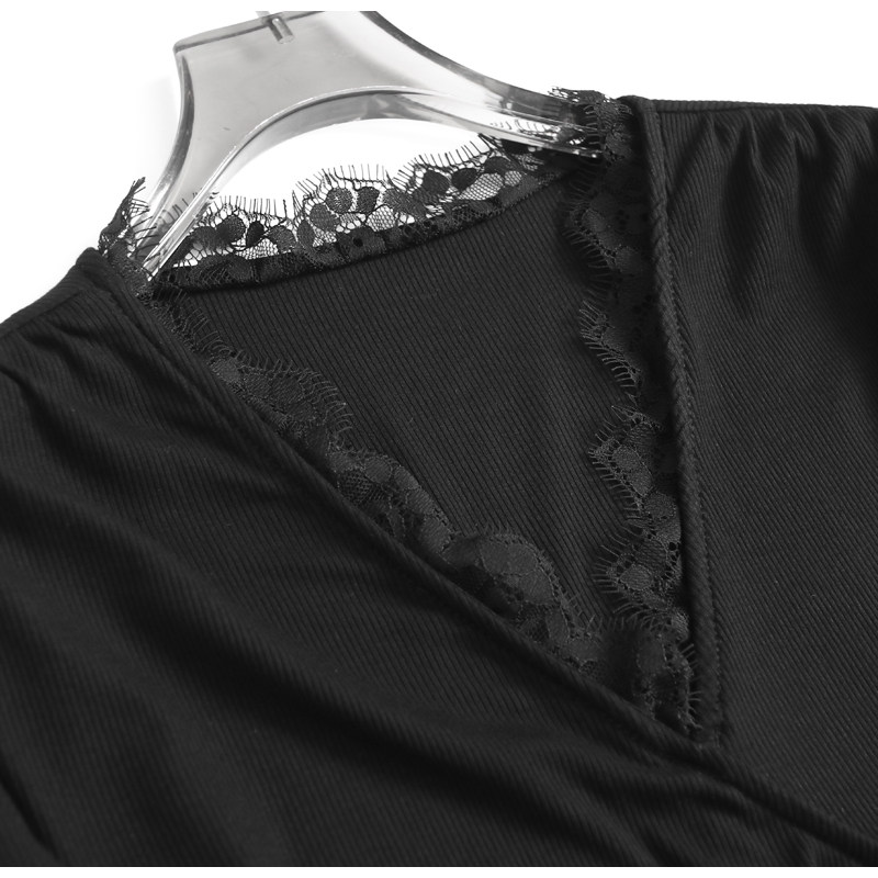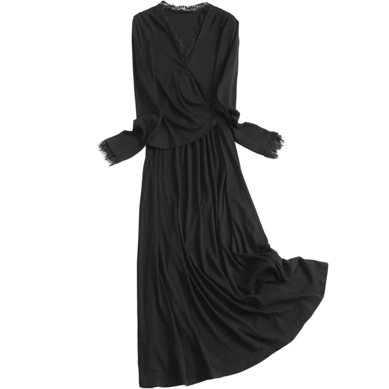 黑色蕾丝花边V领捏褶收腰修身性感掐腰长裙小黑裙女裙连衣裙J206