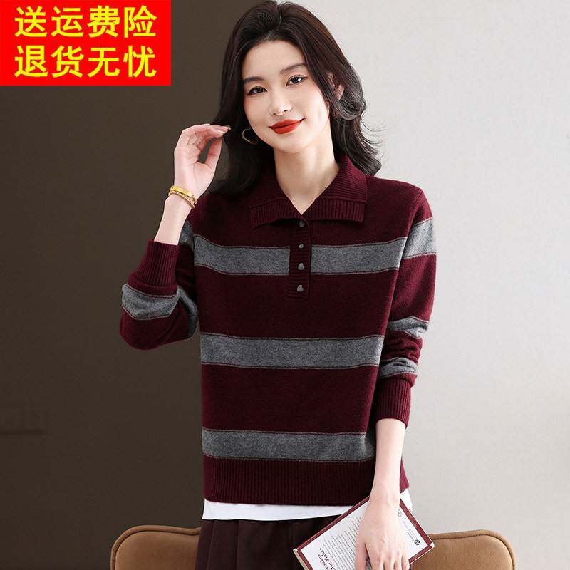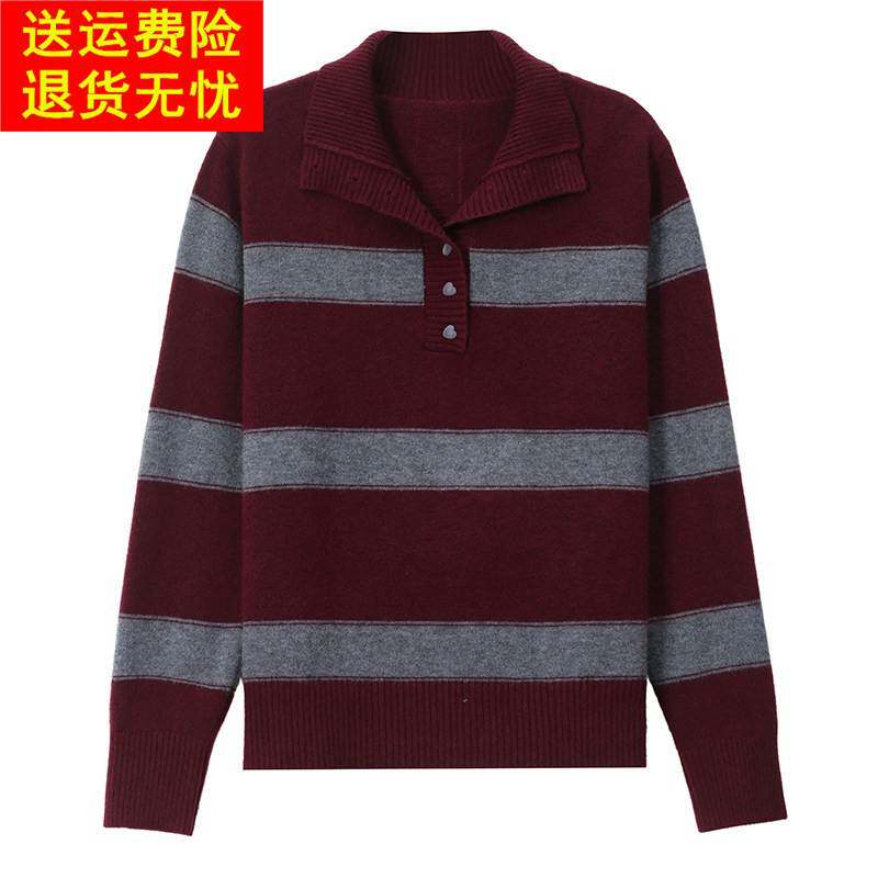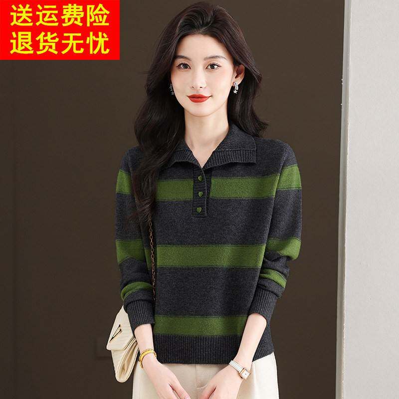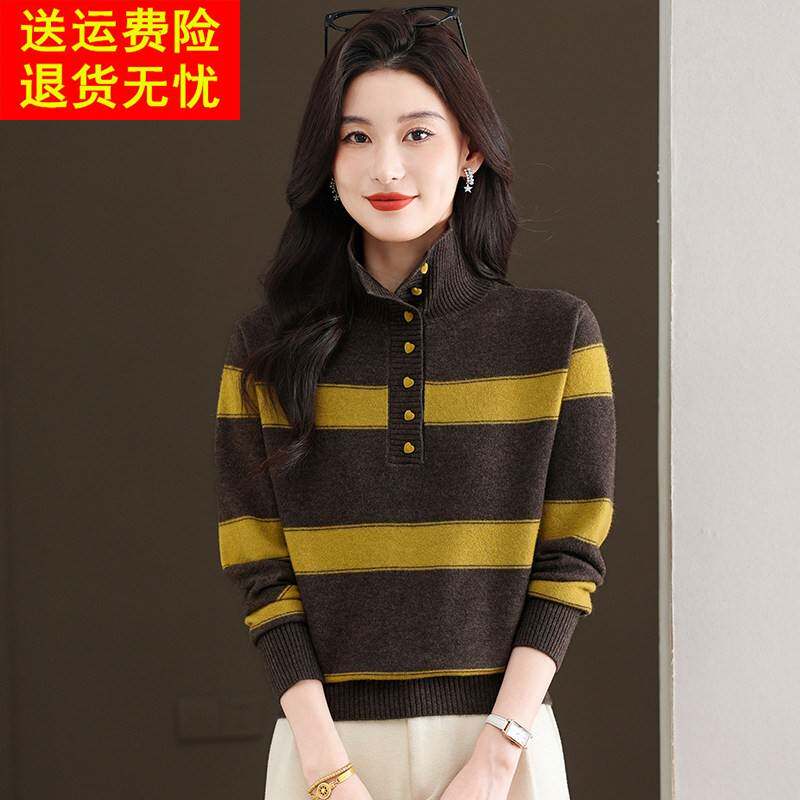 鄂尔多斯市高端羊毛衫女秋冬翻领条纹针织打底衫显瘦毛衣内搭上衣
