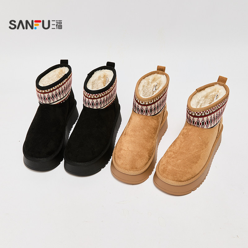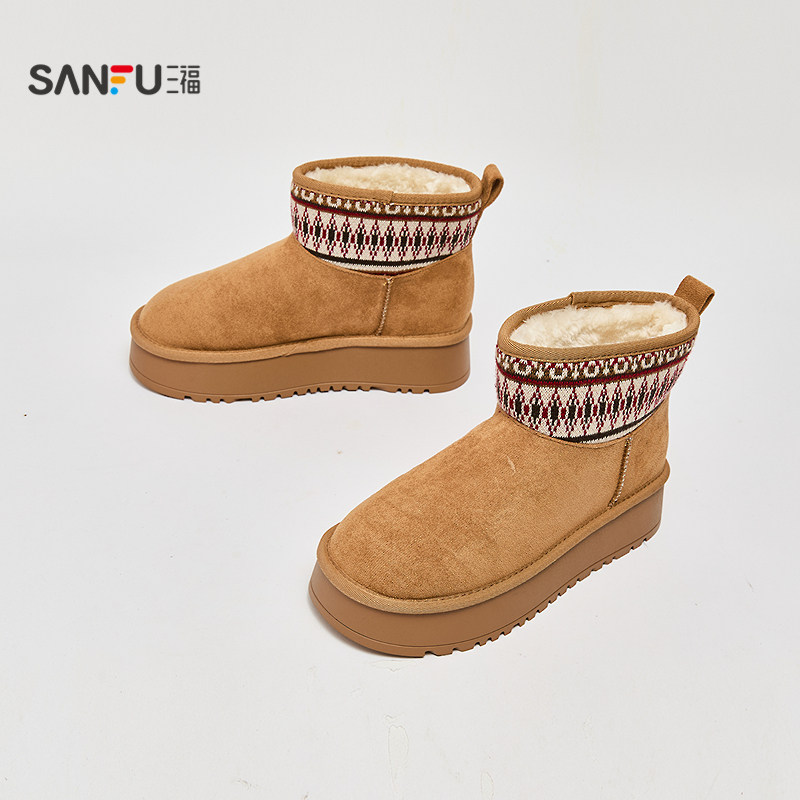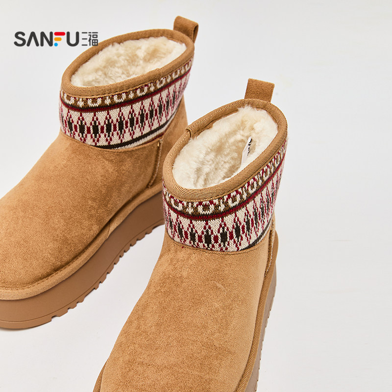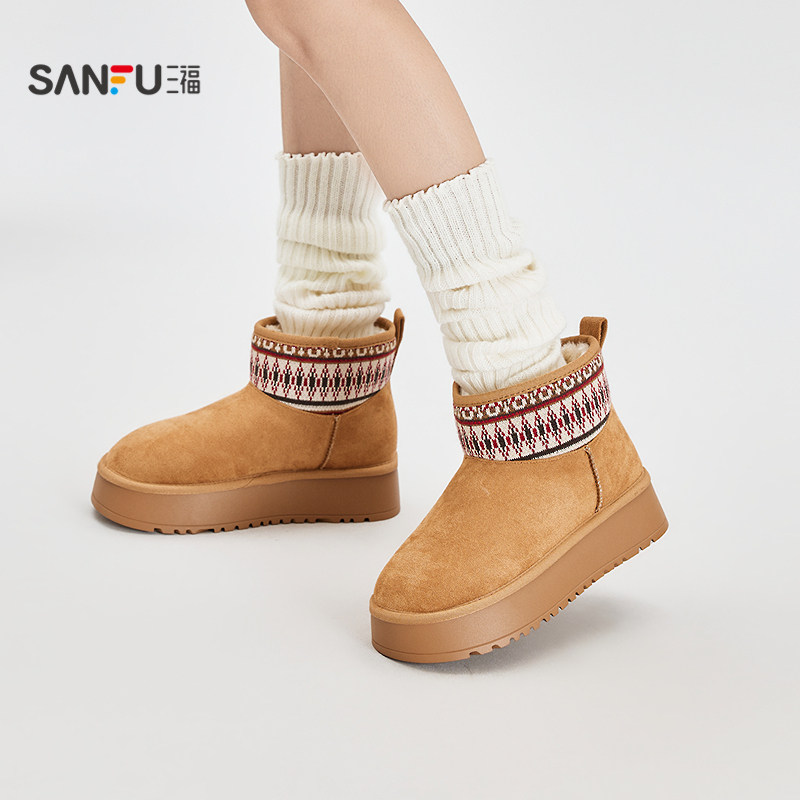 三福女毛毛鞋冬季民族风靴筒增高厚底圆头雪地靴女鞋848786