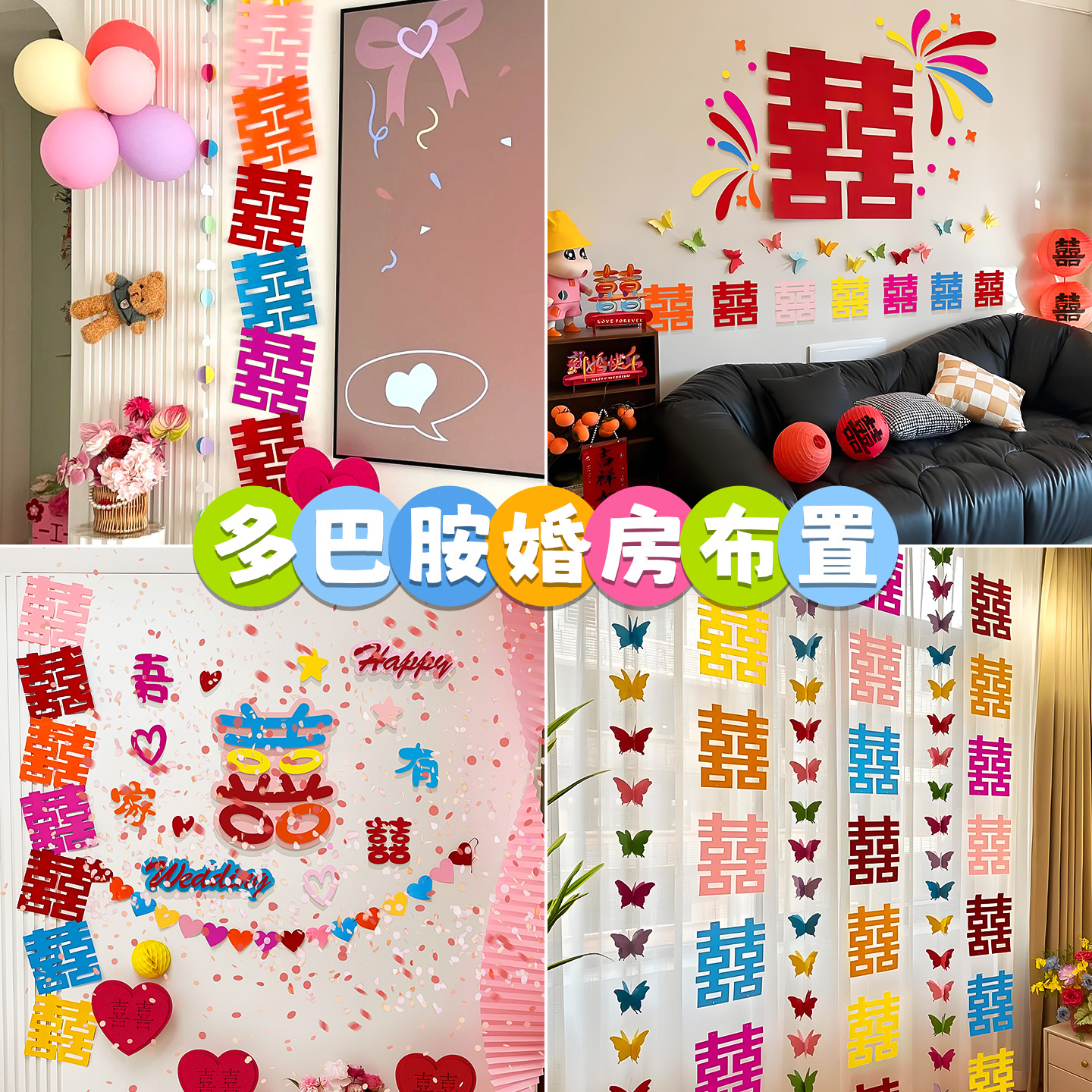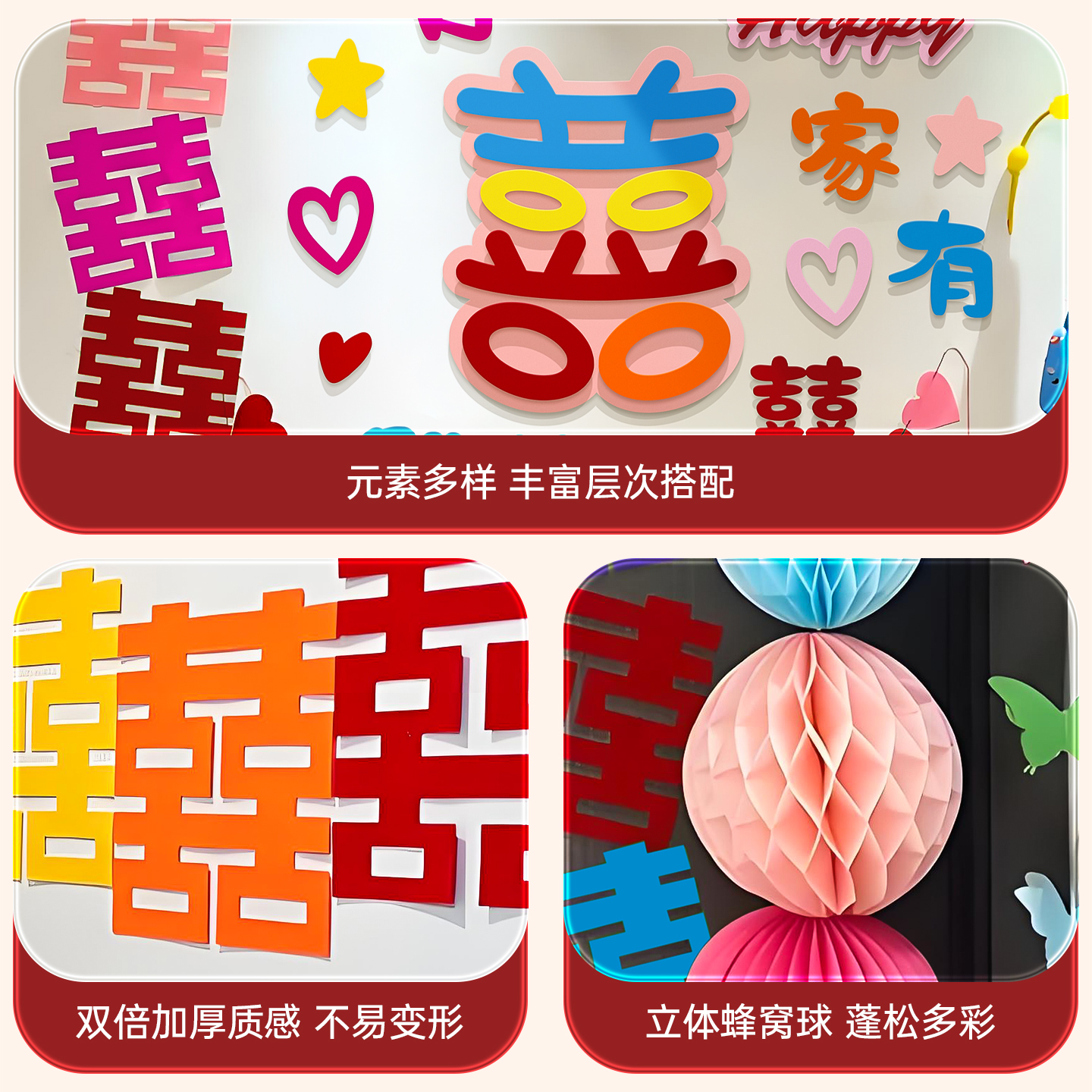 多巴胺喜字背景墙婚房布置套装客厅沙发婚礼装饰结婚专用囍字贴纸
