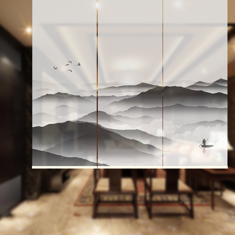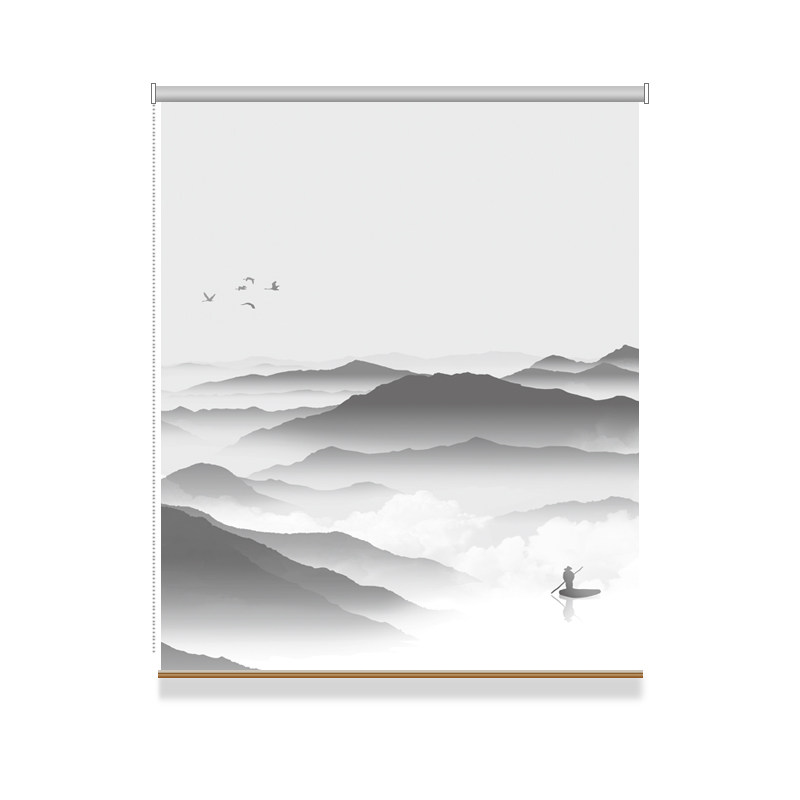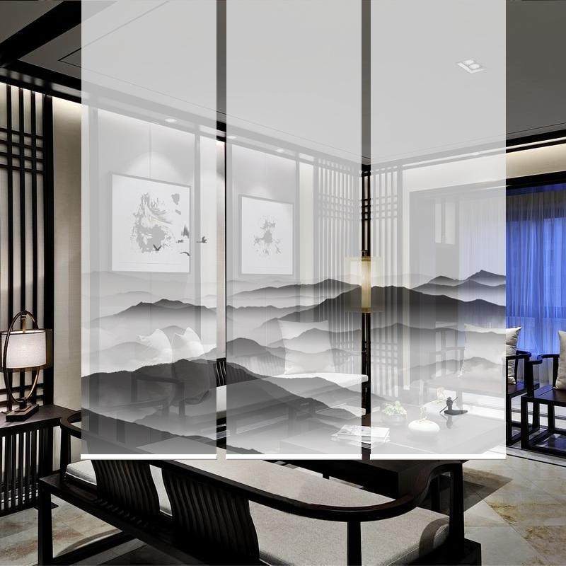 包邮新中式水墨古典山河景色纱透窗帘隔断屏风国画遮光办公室卷帘