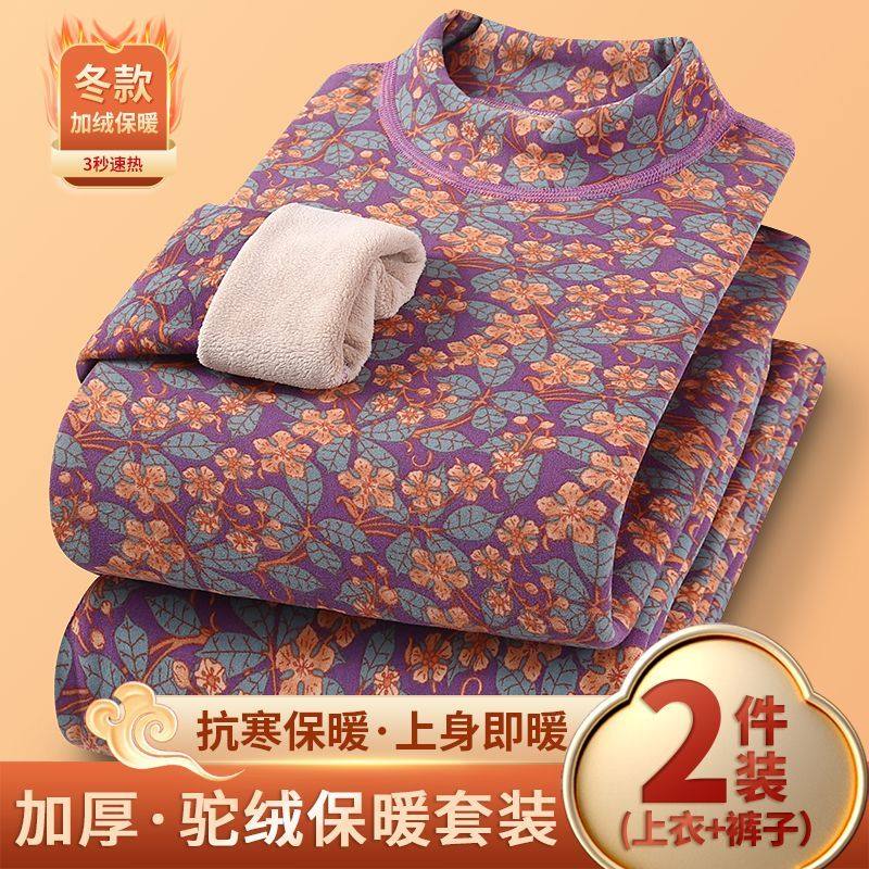 新款中老年加绒加厚纯棉保暖内衣套装女士中领大码妈妈装热卖包邮