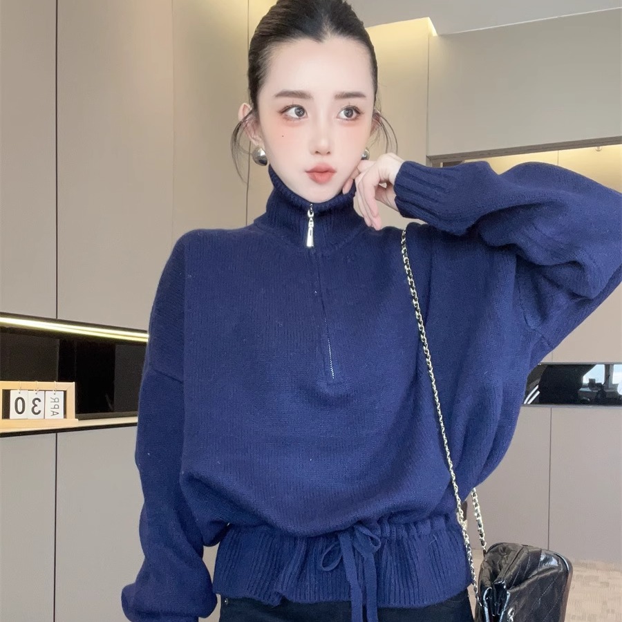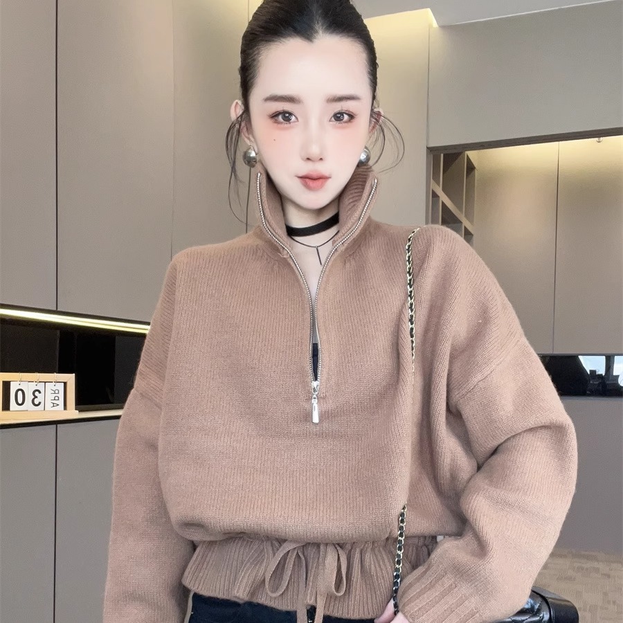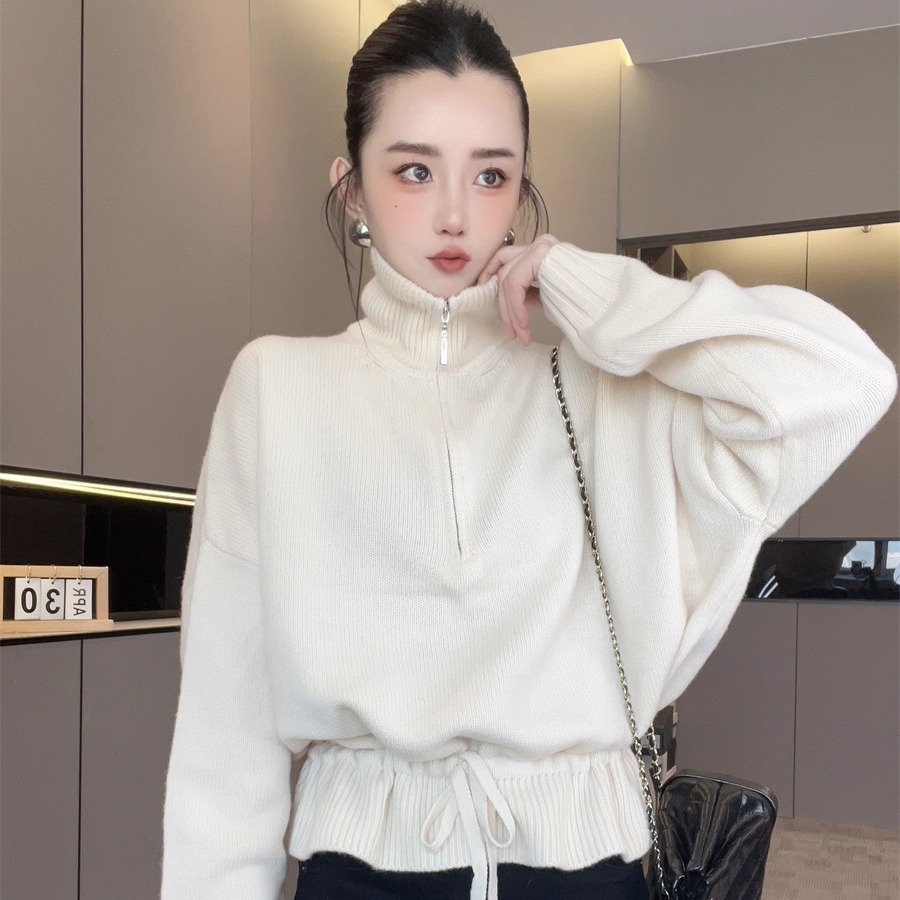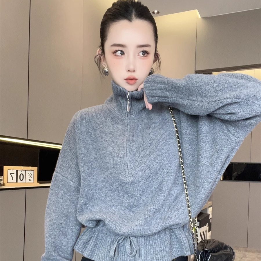 羊毛毛衣针织衫女款2025新款抽绳收腰高领半拉链纯色宽松欧货上衣