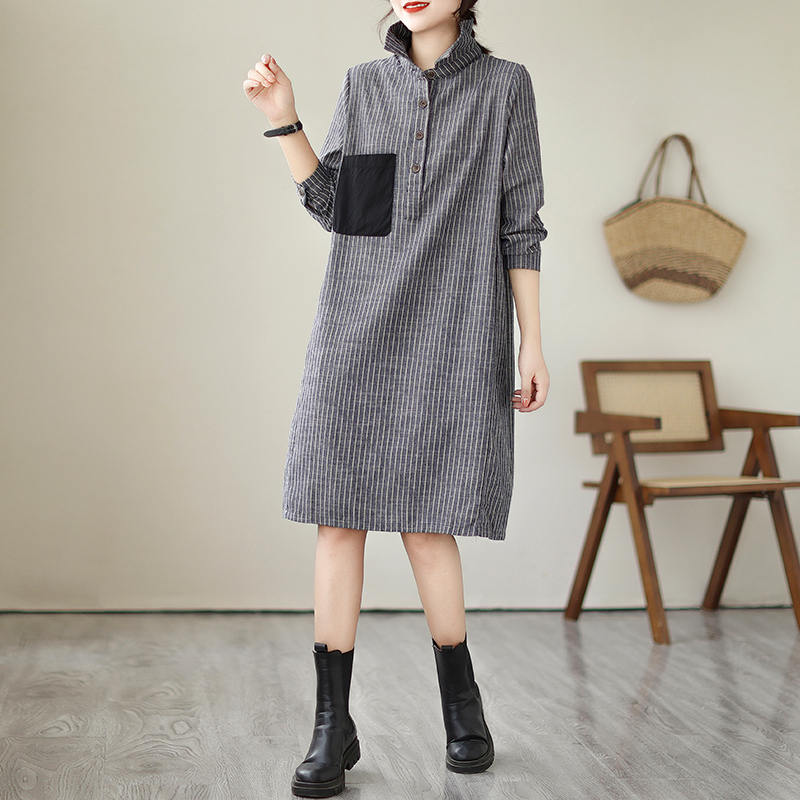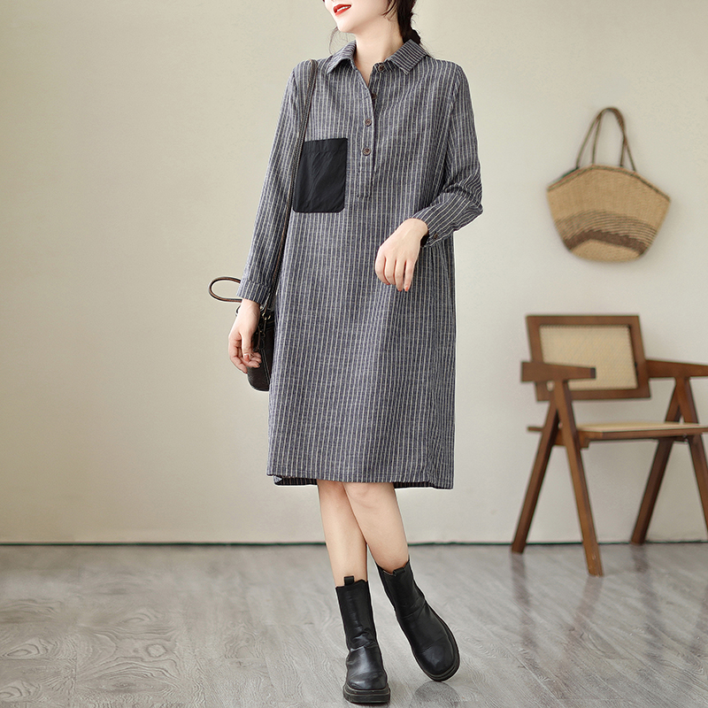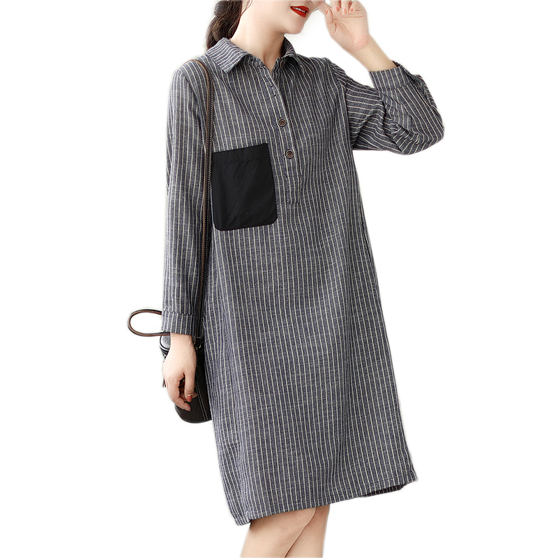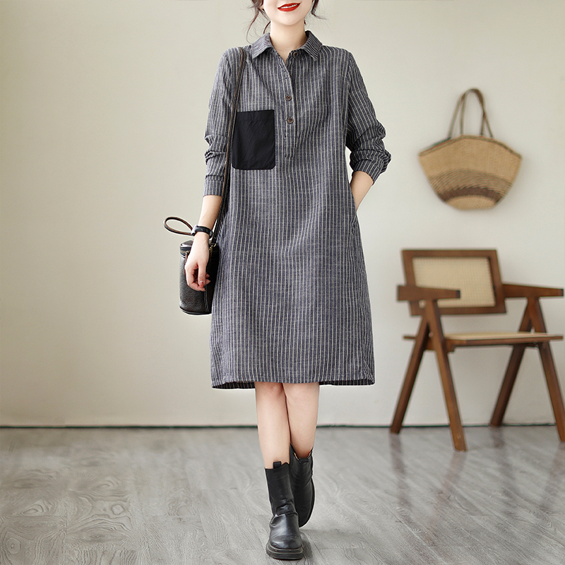 文艺竖条纹棉麻polo领衬衫连衣裙