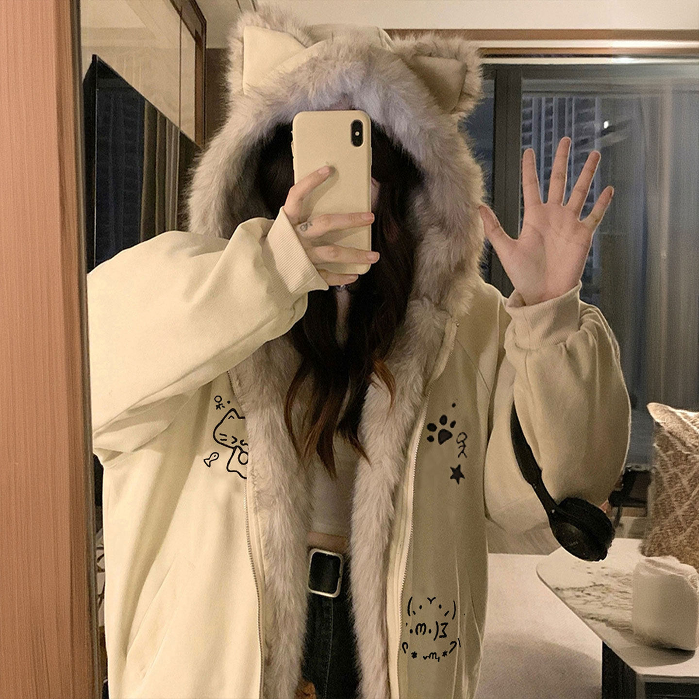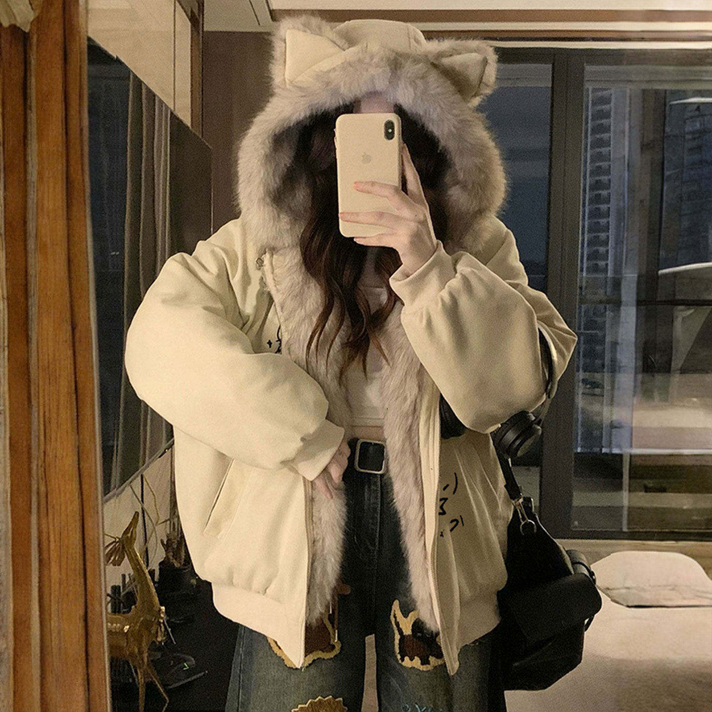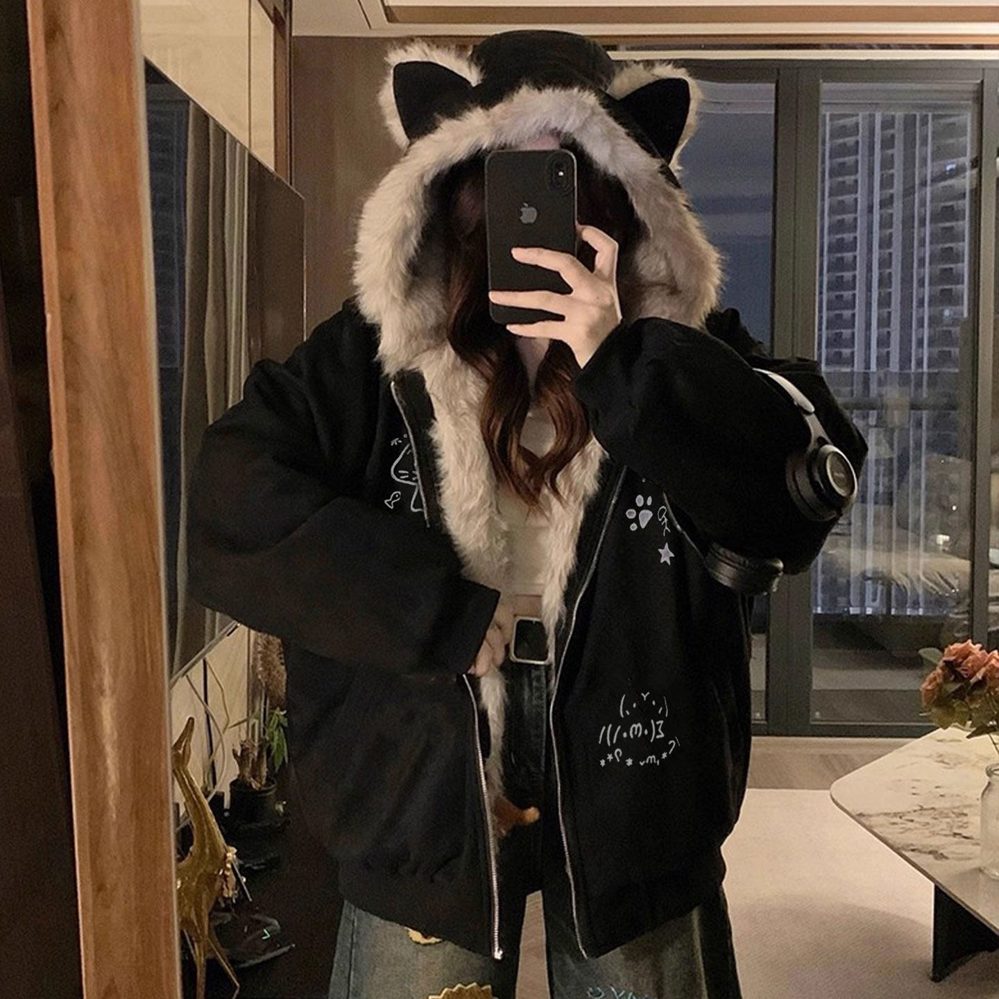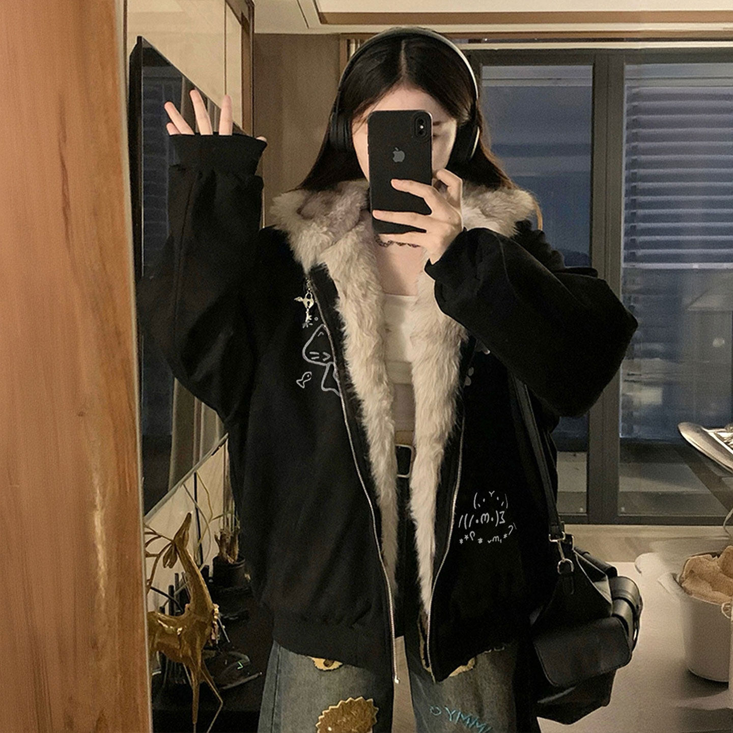 大码女装减龄学院风黑色连帽毛绒外套女胖mm加厚显瘦ins保暖棉服