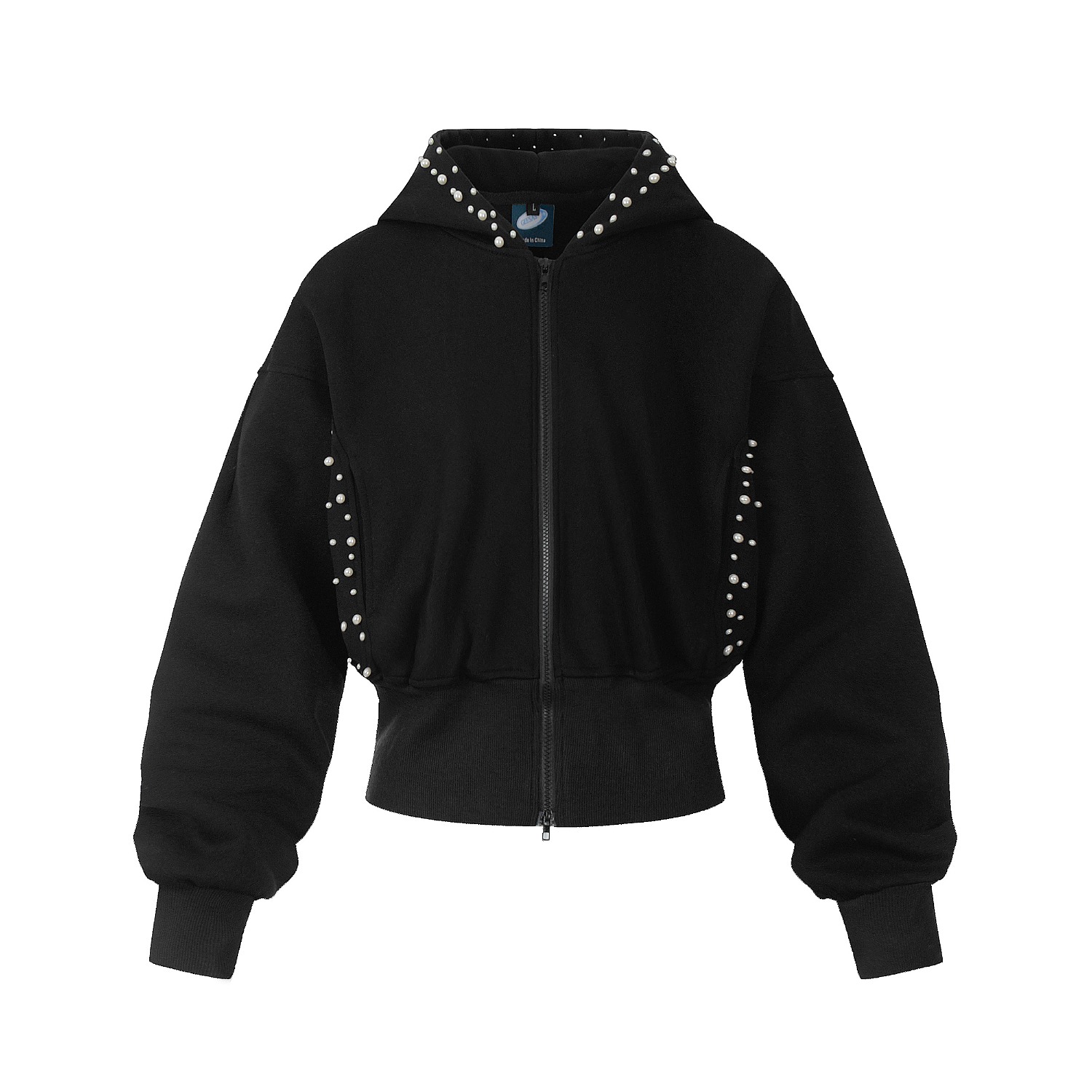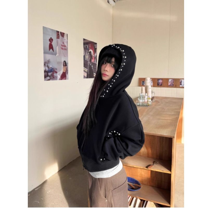美式复古珍珠设计感连帽短款卫衣女外套春秋辣妹运动服休闲上衣潮