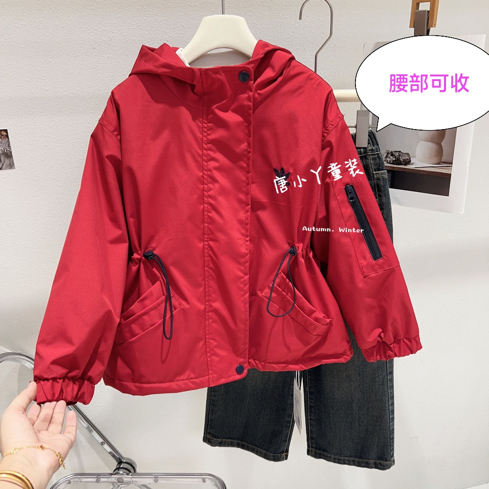 女童加绒冲锋衣红色连帽外套纯色抽绳收腰刺绣韩版拉链开衫中大童