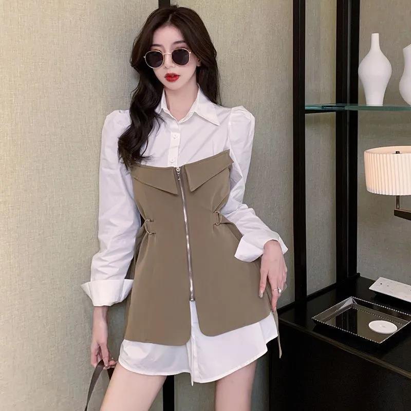 气质女神范假两件不规则衬衫裙2025早秋设计感小众拼接收腰连衣裙