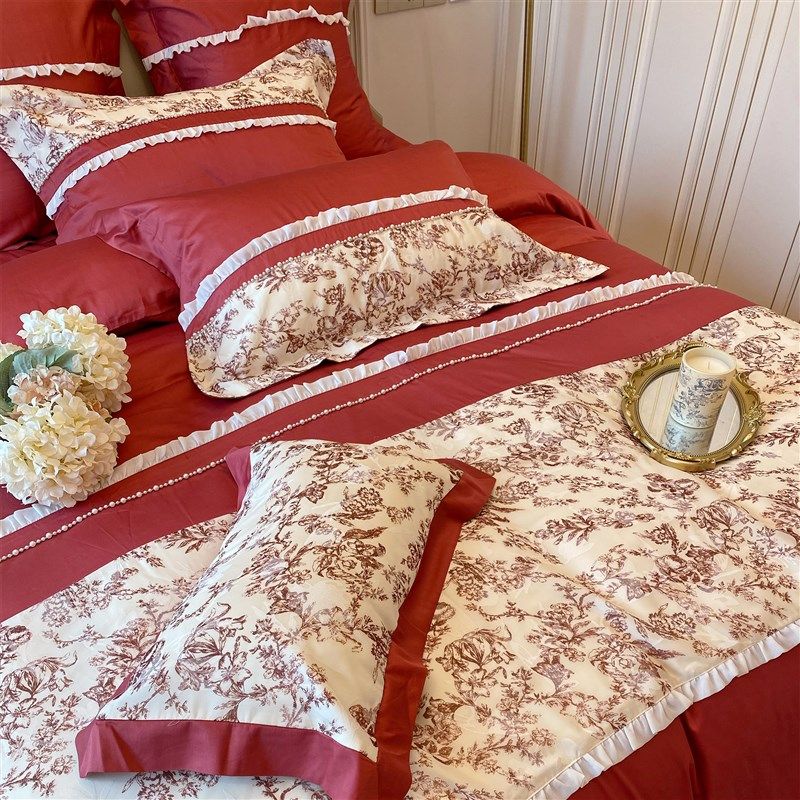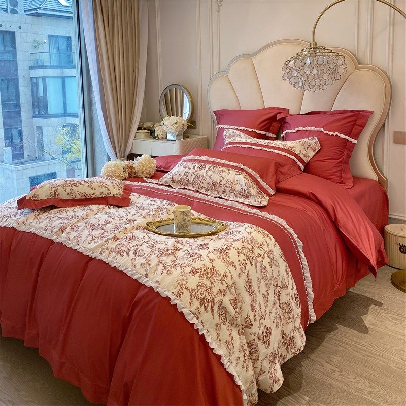法式全棉印花新婚庆四p件套全棉100支长绒棉红色结婚被套床单床笠