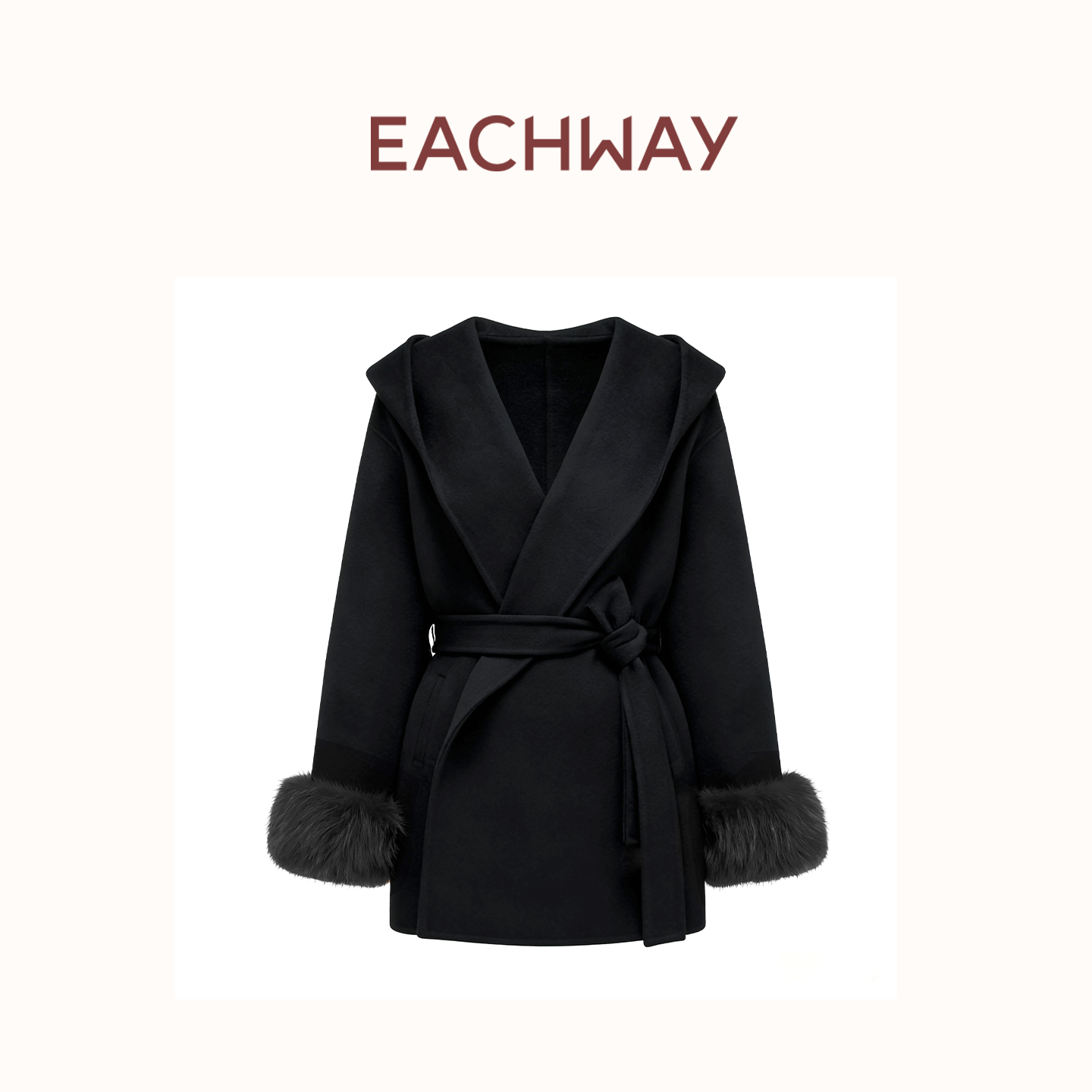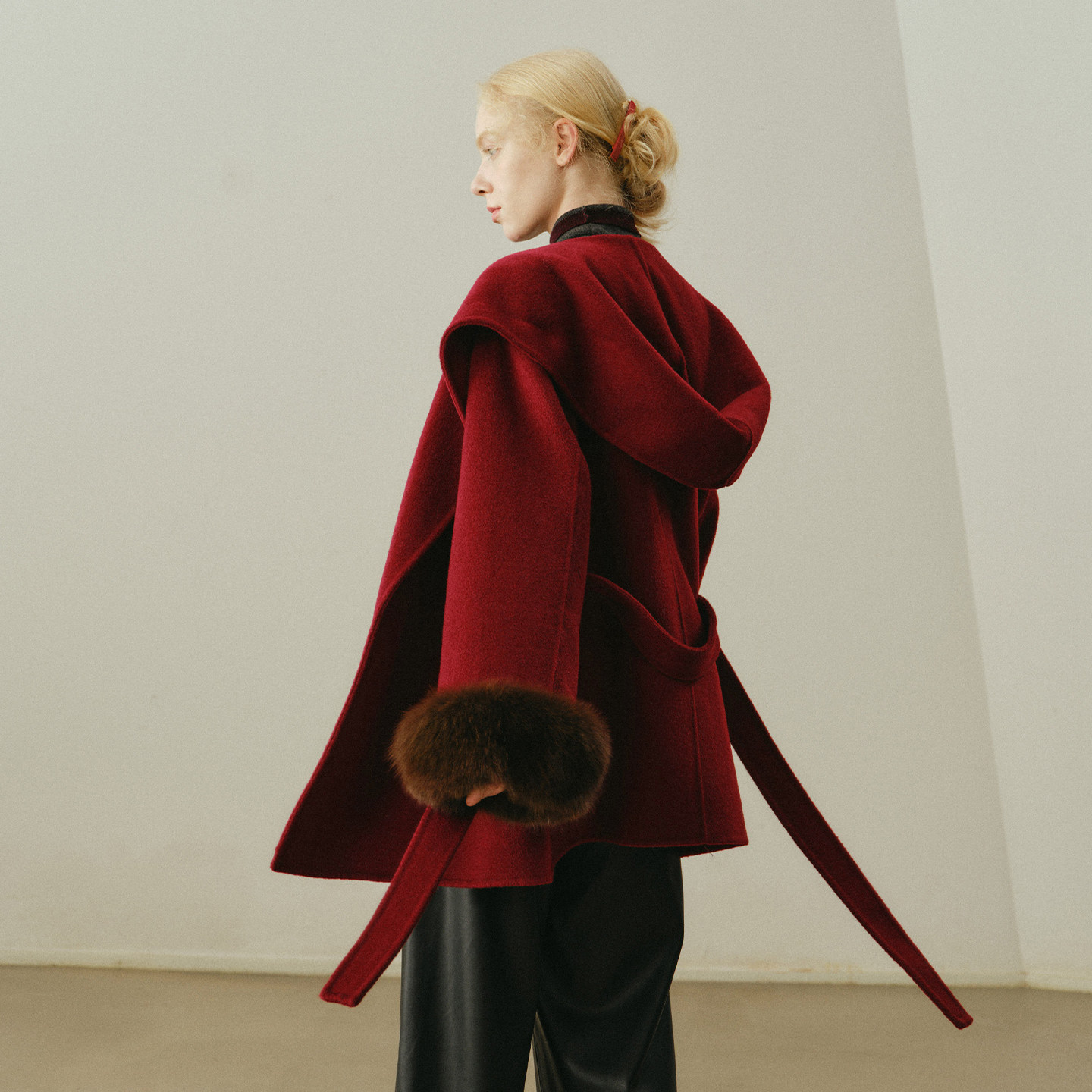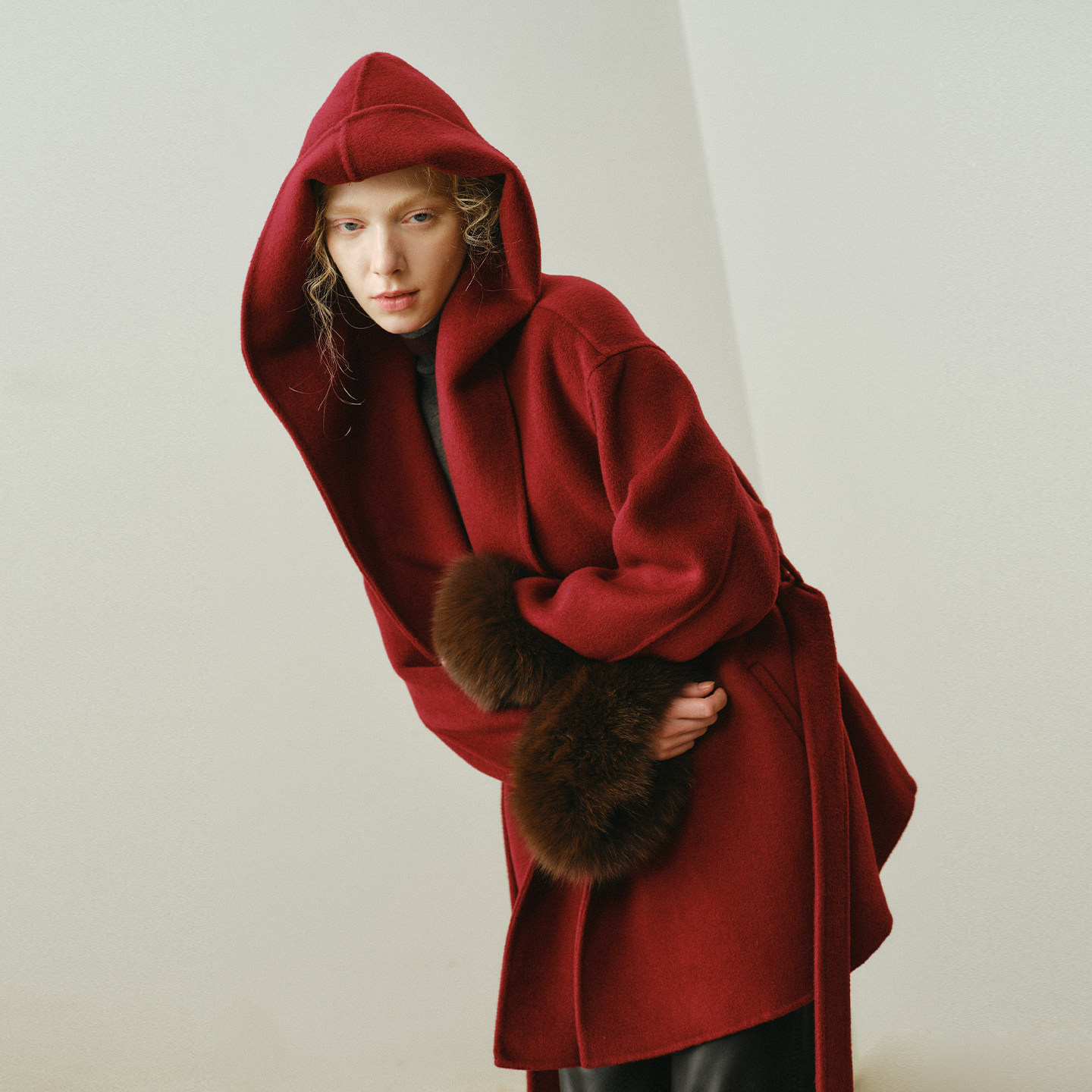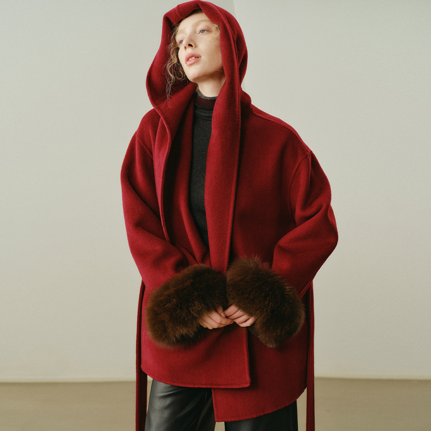 艺之卉绵羊毛羊绒双面呢大衣圣诞新年红狐狸毛保暖外套2025冬新款