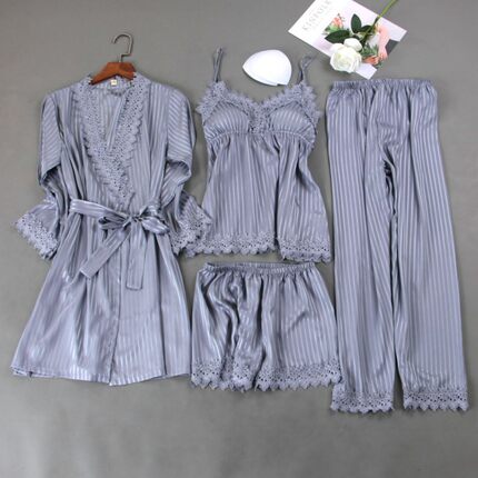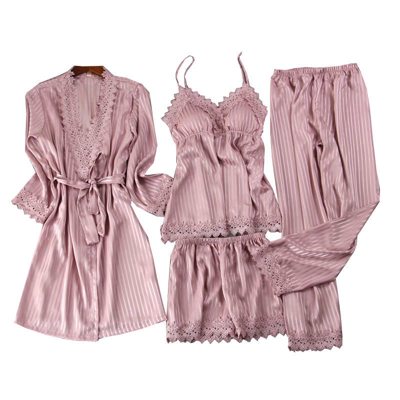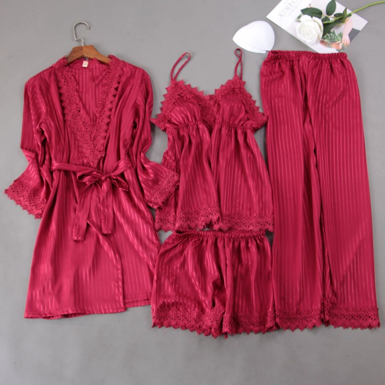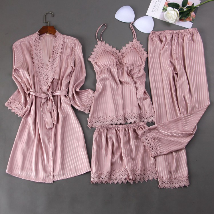 春秋睡衣女性感吊带四件套冰带胸垫丝绸长袖夏天薄款睡袍长裤套装