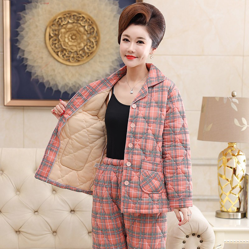 中老年睡衣女秋冬季三层加厚纯棉夹棉中年妈妈老人保暖家居服套装