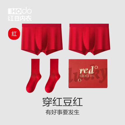 红豆男士本命年内裤红色纯棉裆结婚喜庆袜子平角裤送礼礼盒套装