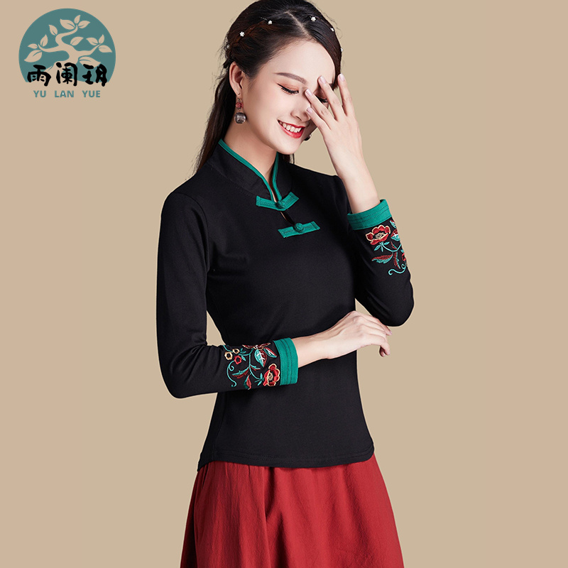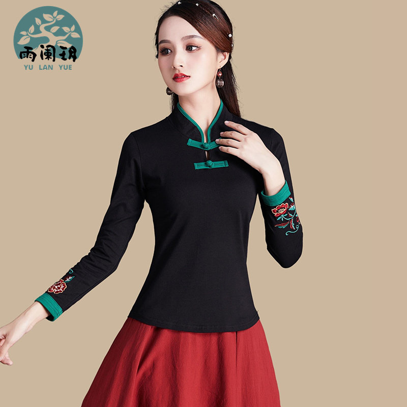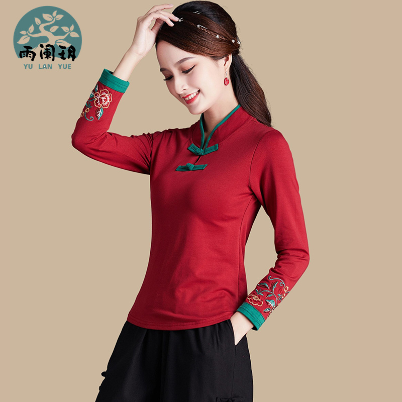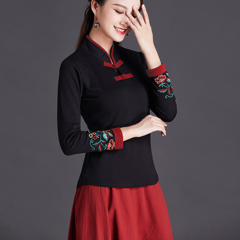 中国风盘扣立领上衣女 秋冬季绣花民族风女装长袖刺绣大码打底t恤