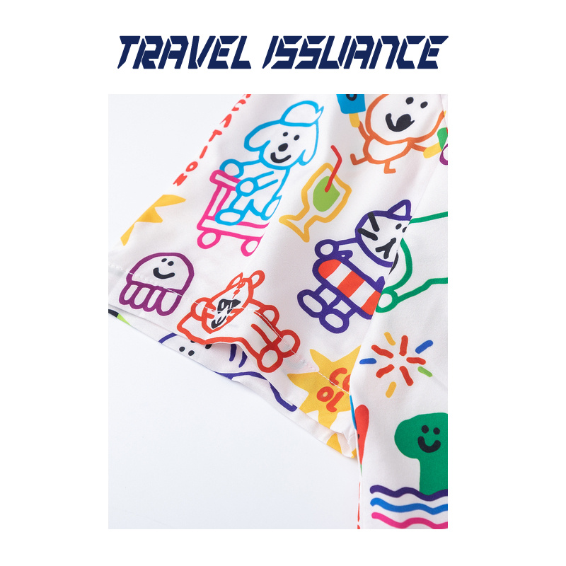 TRAVEL ISSUANCE 海边游玩 原宿风复古涂鸦满印短袖衬衫宽松男女