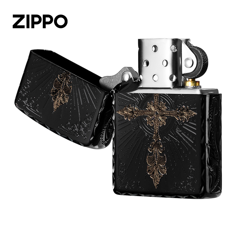 zippo打火机十字光焰芝宝防风煤油 黑曜冰咬边送男朋友圣诞节礼物