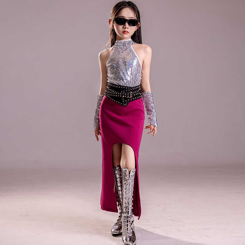 女童挂脖亮片上衣包臀半身裙套装模特T台个性走秀表演服女孩礼服