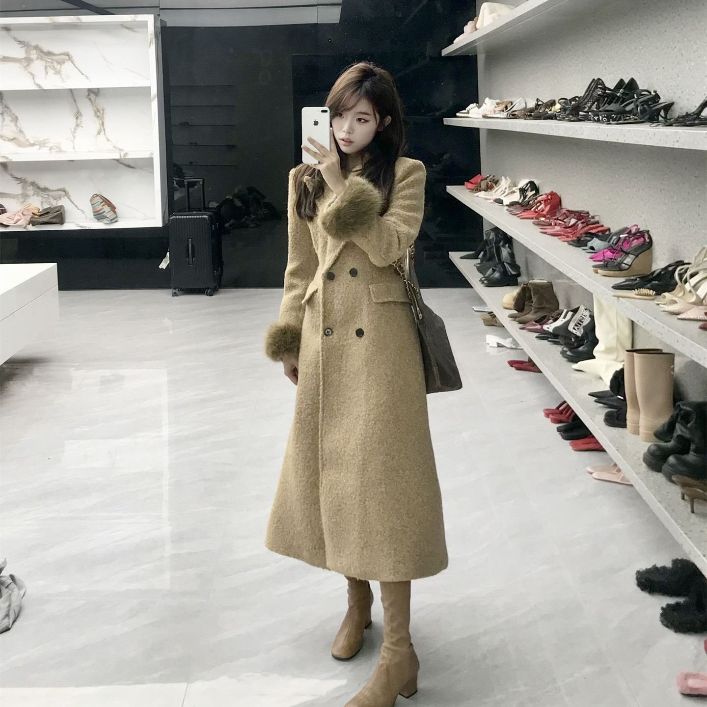 富家千金风毛毛袖收腰呢子大衣女冬季高级感修身显瘦长款毛呢外套