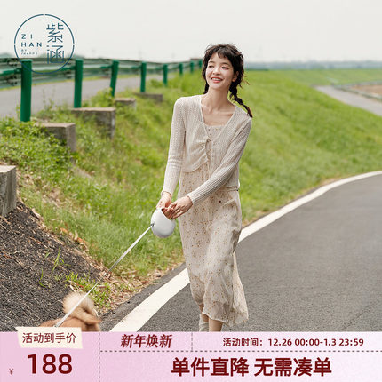 紫涵吊带裙套装夏新款雪纺碎花连衣裙+短款针织镂空小外套两件套