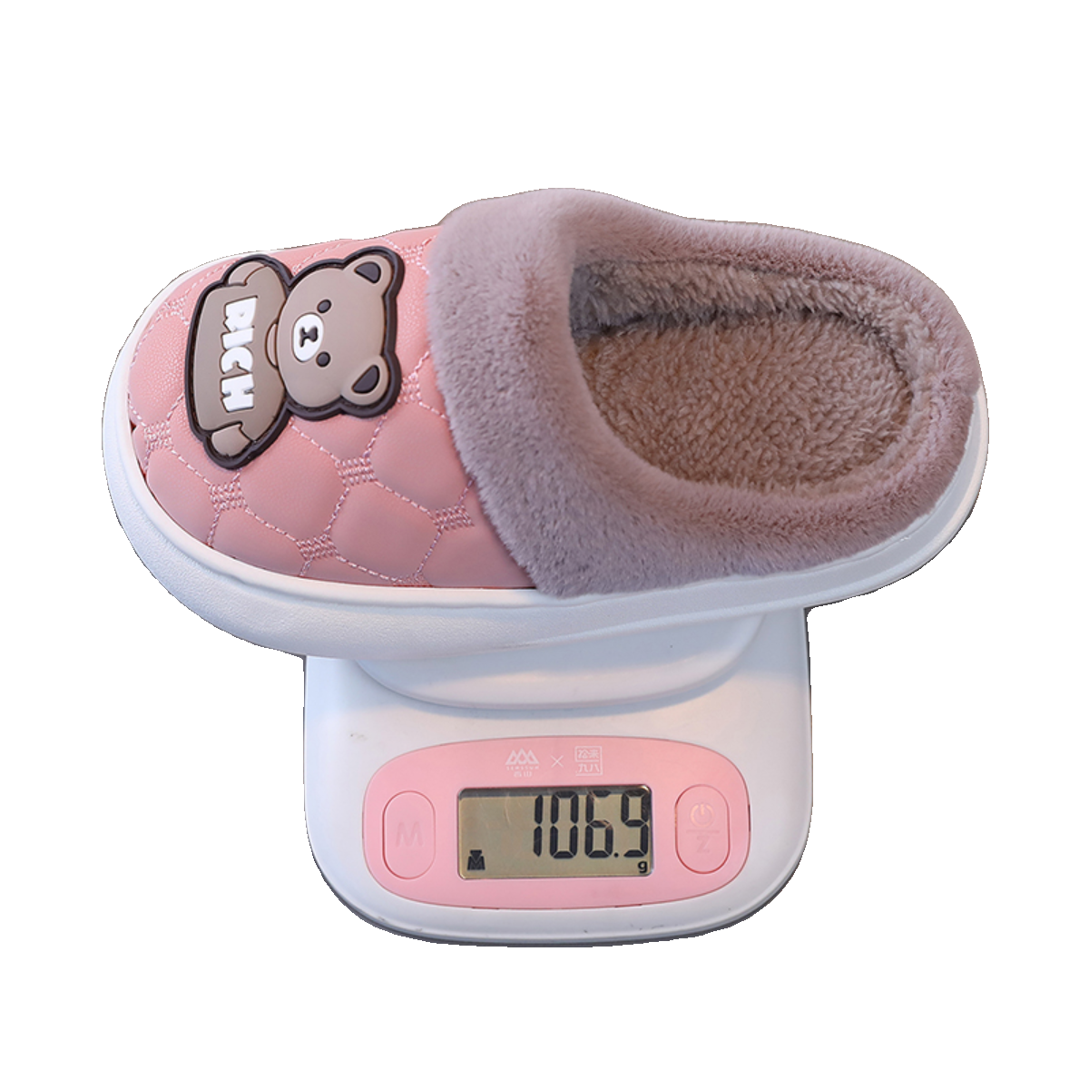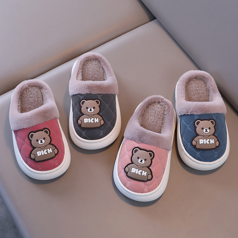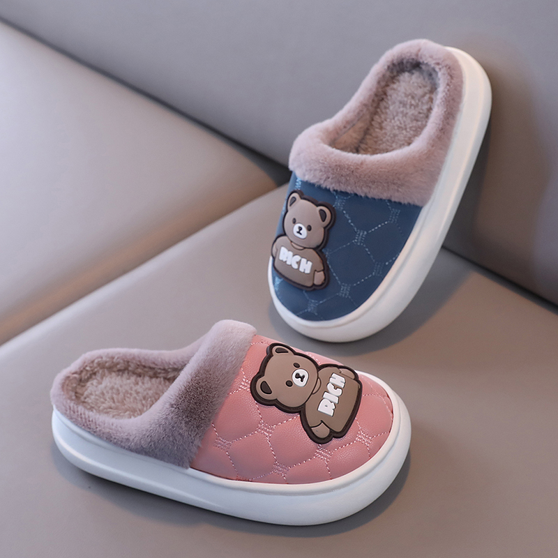 秋冬季儿童棉拖鞋男大童室内防滑软底家居鞋PU皮面防水女孩毛毛鞋