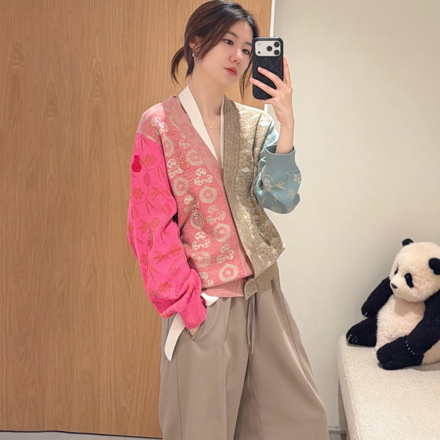 商场同款2026年春季新款时髦拼色提花刺绣针织开衫女撞色毛衣外套
