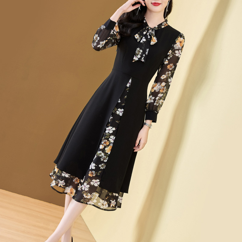 雪纺碎花假两件连衣裙显高2025春秋季新款气质微胖妈妈遮肚子显瘦