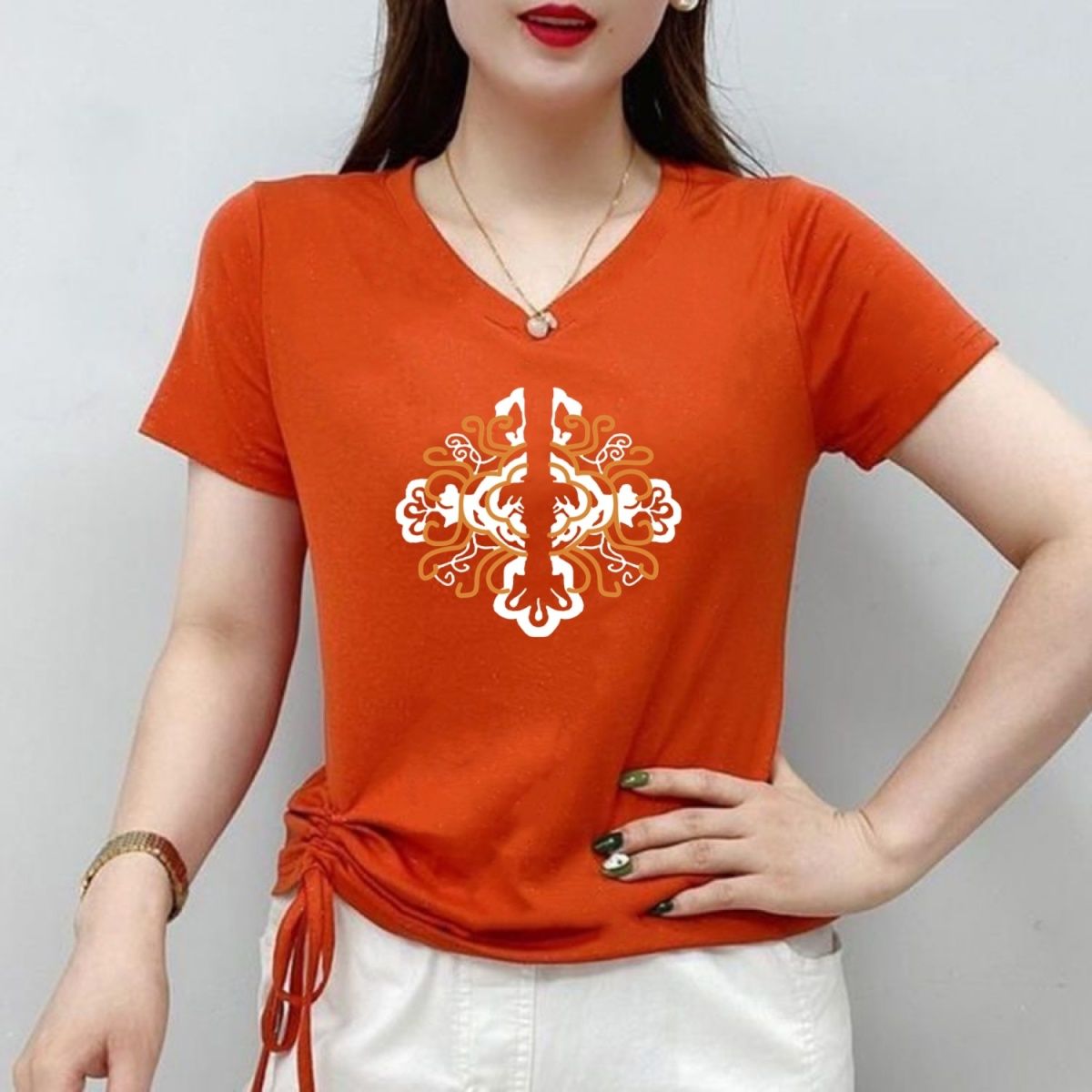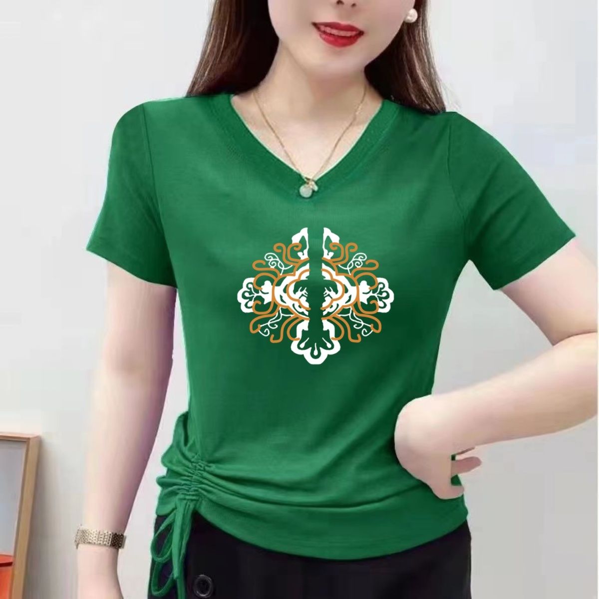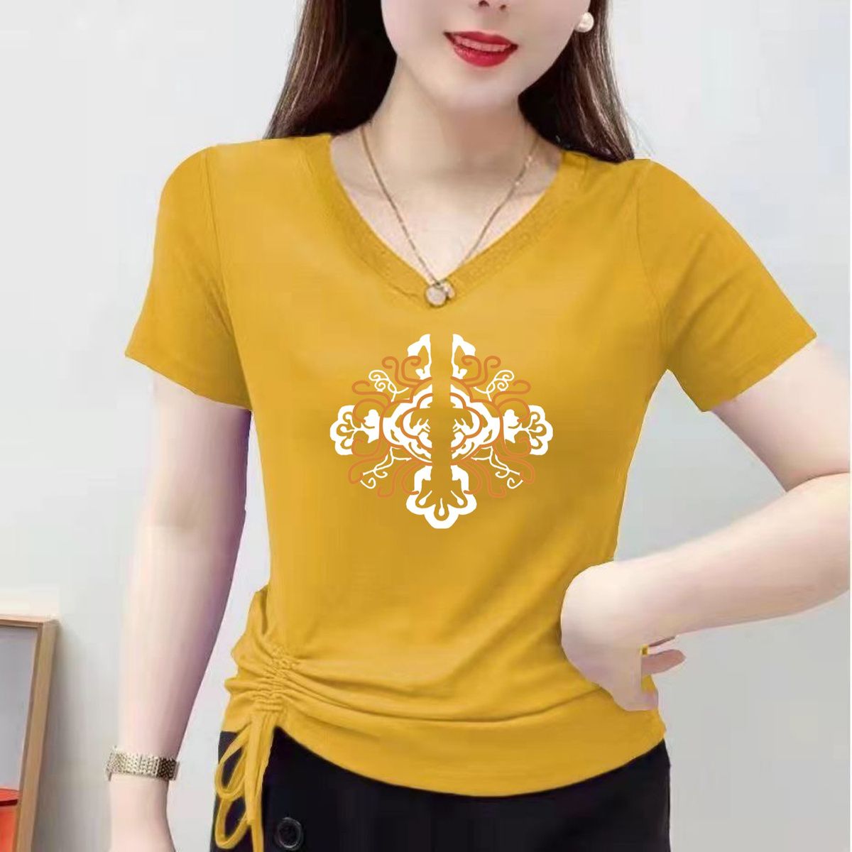 新中式国风大码夏女士v领短袖t恤遮肚子显瘦2025纯棉体恤衫上衣潮
