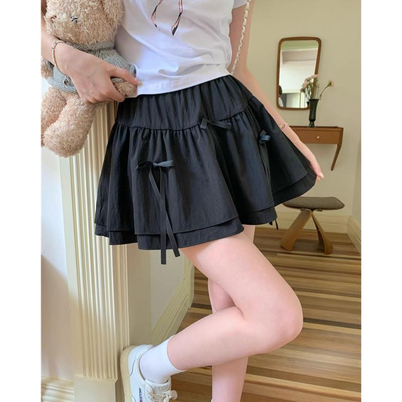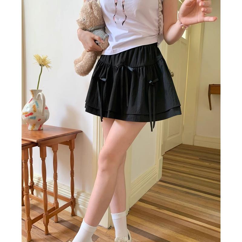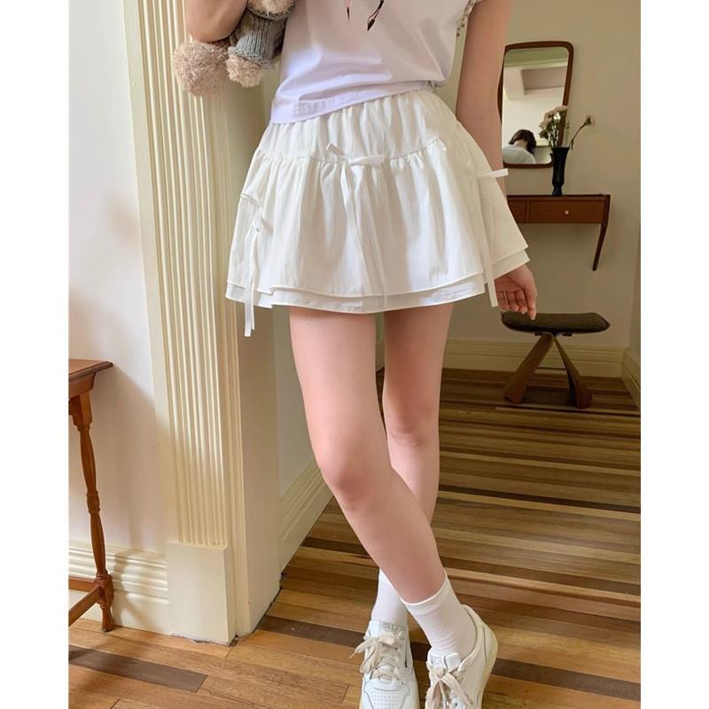 芭蕾风白色蝴蝶结抽褶半身裙女夏季法式蓬蓬蛋糕裙高腰A字短裙子