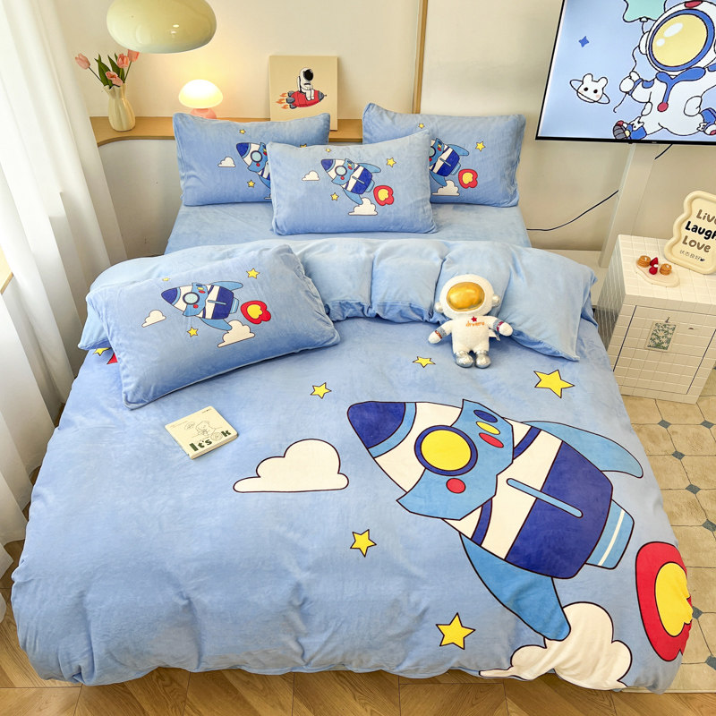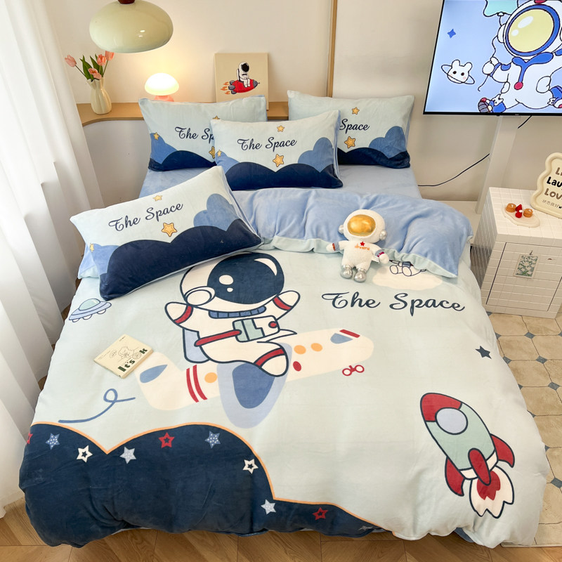 男孩加厚牛奶绒四件套宇航员法兰珊瑚绒床单卡通儿童被套三件套冬