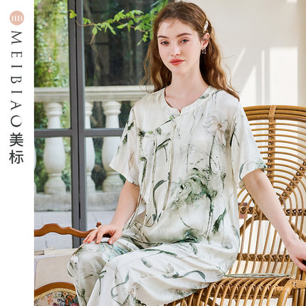 美标19姆米重磅真丝短袖睡衣套装女春夏桑蚕丝绸睡衣中国风家居服