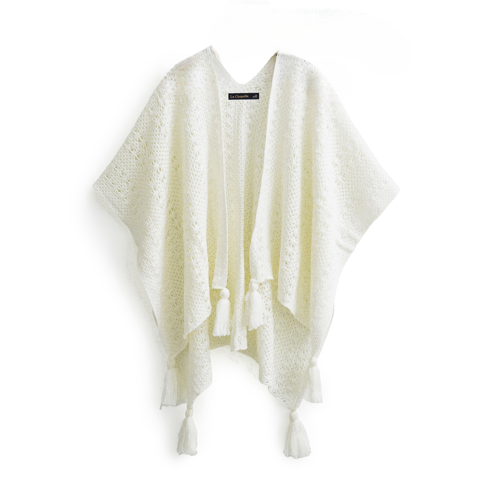 拉夏贝尔/La Chapelle民族风纯色镂空斗篷开衫女旅游流苏针织披肩