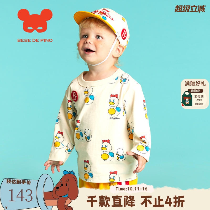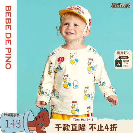BEBEDEPINO贝贝品诺男女婴米白色长袖印花T恤可爱卡通纯棉百搭
