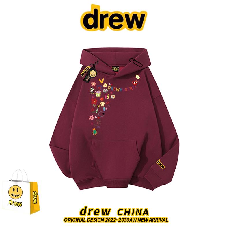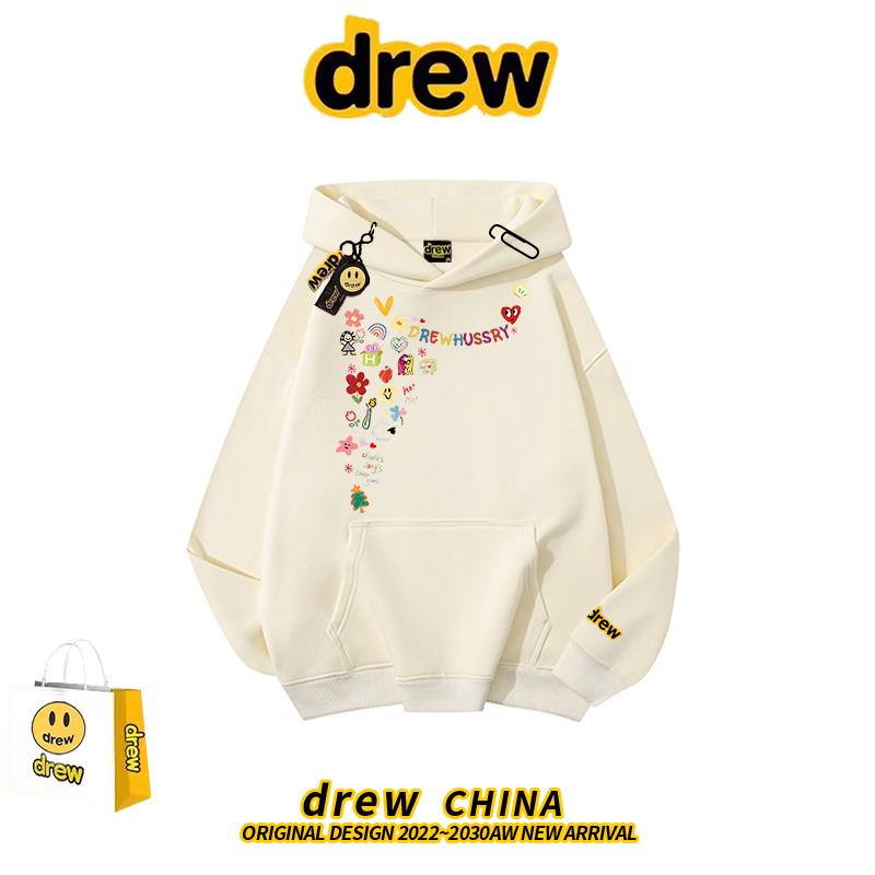 drew美式潮牌卡通涂鸦印花连帽加绒卫衣男女情侣宽松纯棉高街帽衫