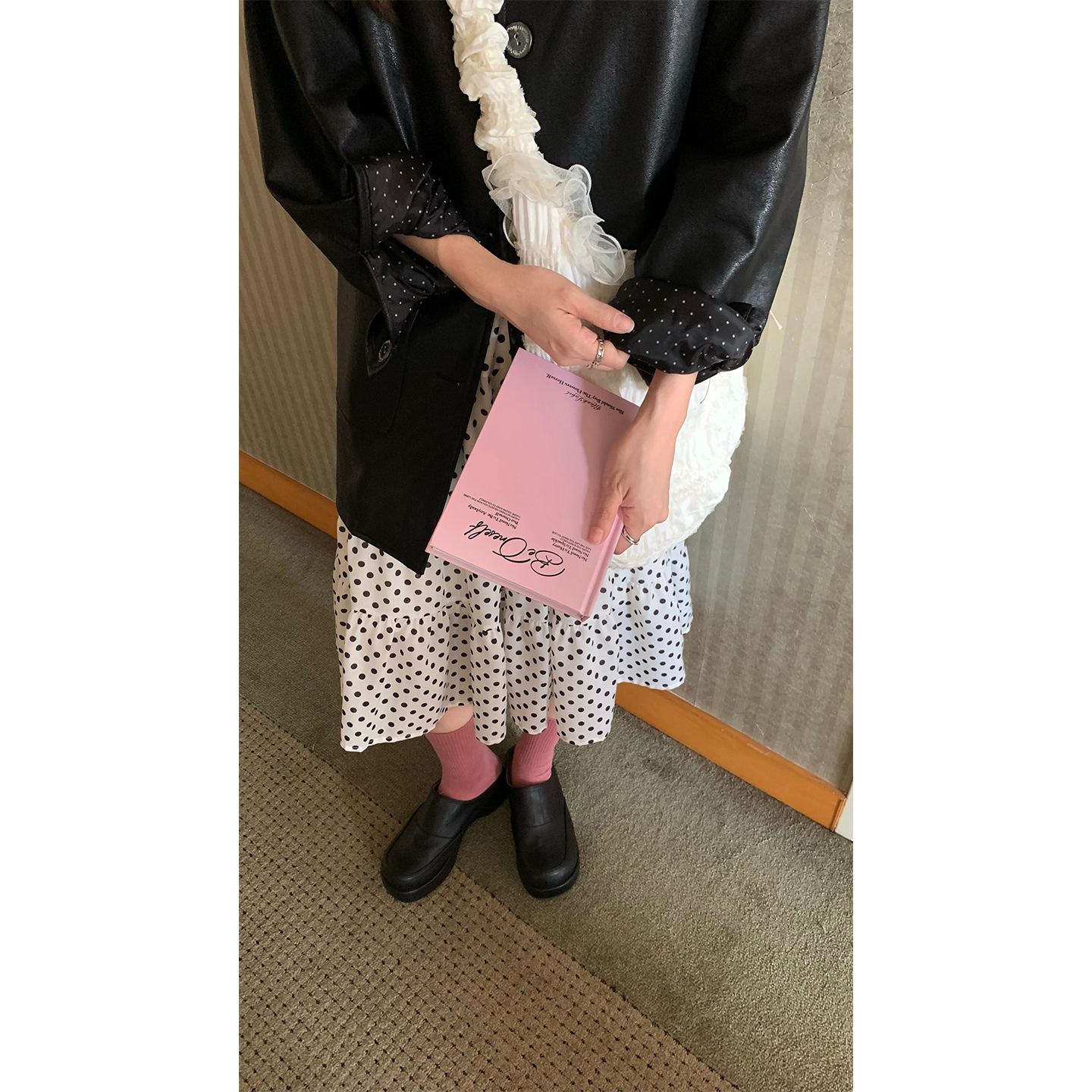 CCKOK 小波点内衬翻领中长款皮衣外套2025秋季新款甜酷黑色夹克女