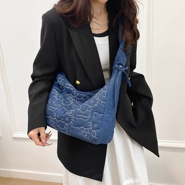 刺绣凯蒂猫牛仔布双肩背包2025新款休闲百搭通勤书包洋气出行旅行
