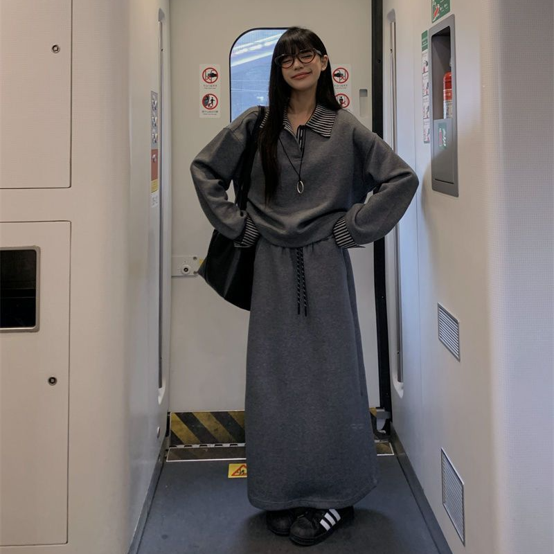 大码灰色假两件卫衣半身裙套装