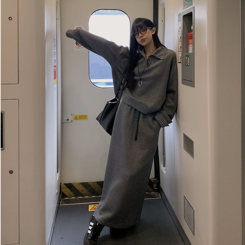 大码灰色假两件卫衣半身裙两件套女秋冬胖mm显瘦遮肉休闲裙子套装