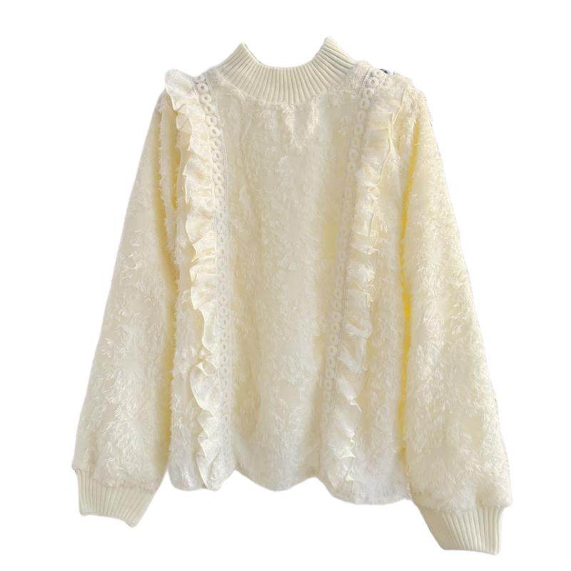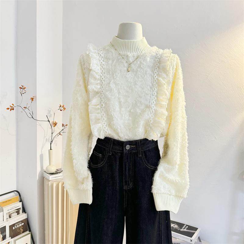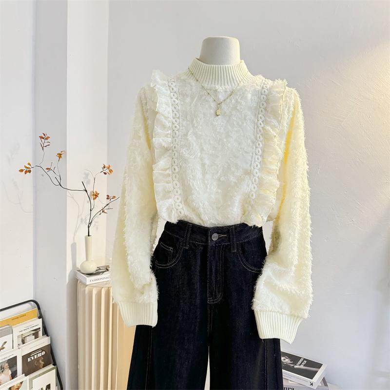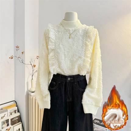 半高领韩版加绒加厚蕾丝衫植绒