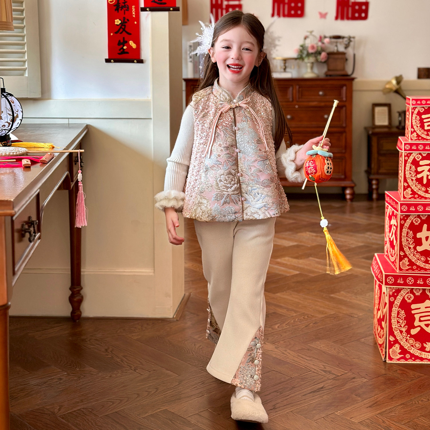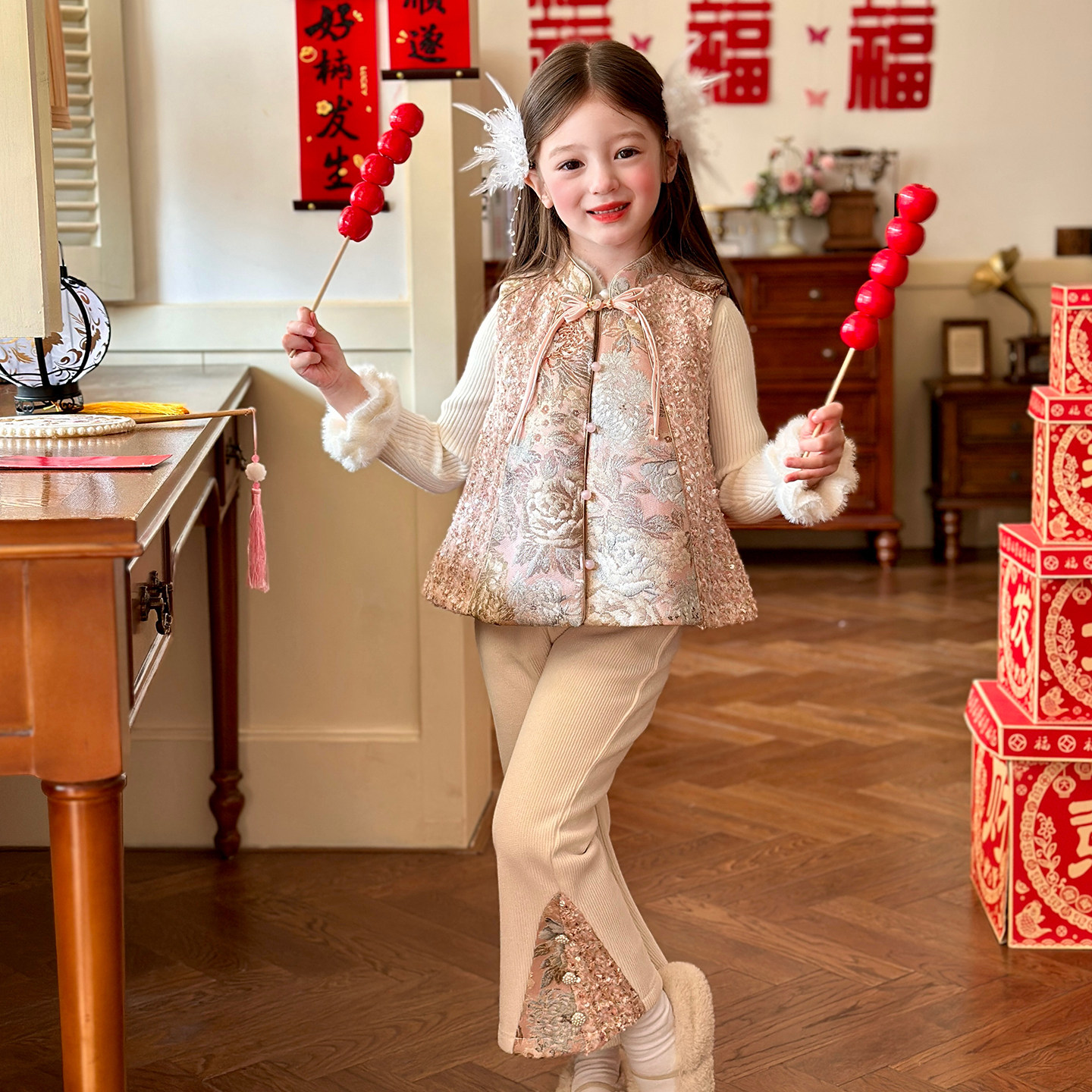 栀了成长童装女童新中式加绒套装2025冬季儿童国风新年提花两件套
