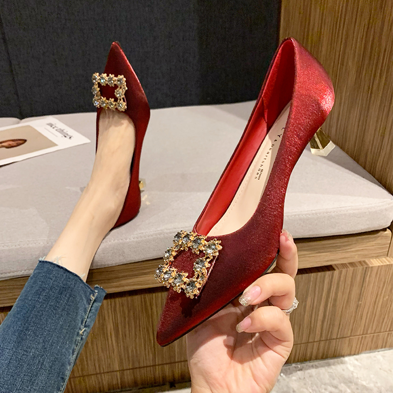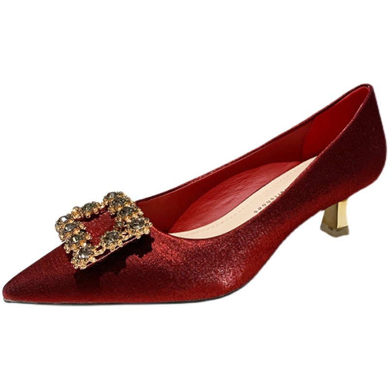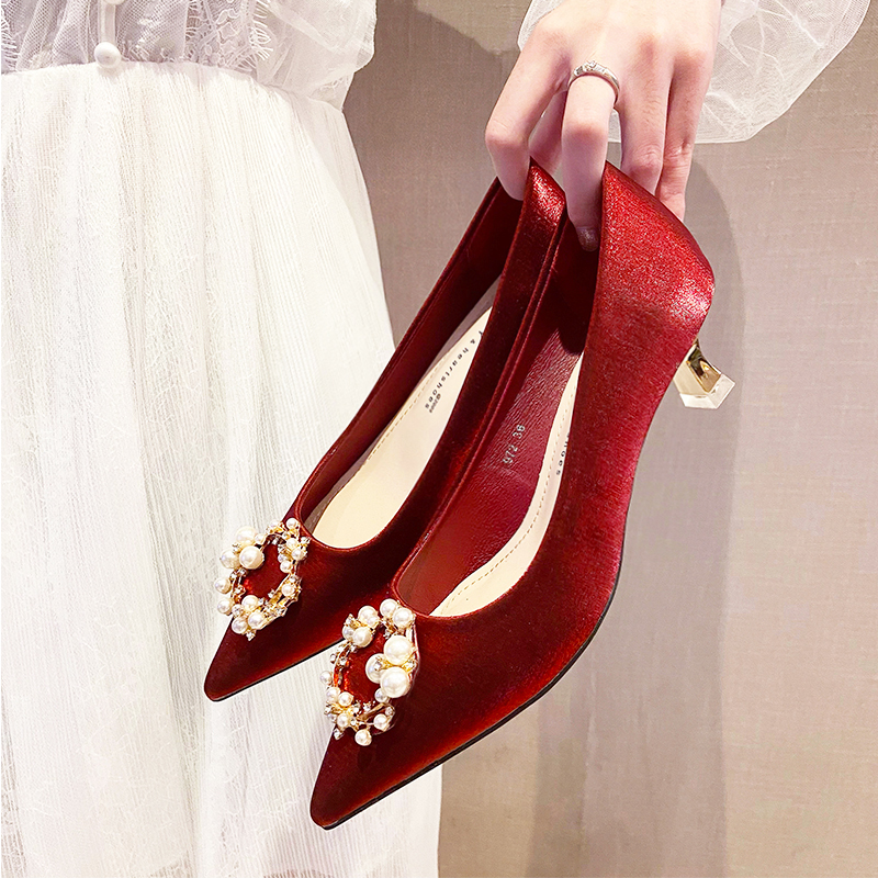 红色珍珠高跟鞋2025年新款尖头水钻低跟百搭秀禾婚纱两穿新娘婚鞋