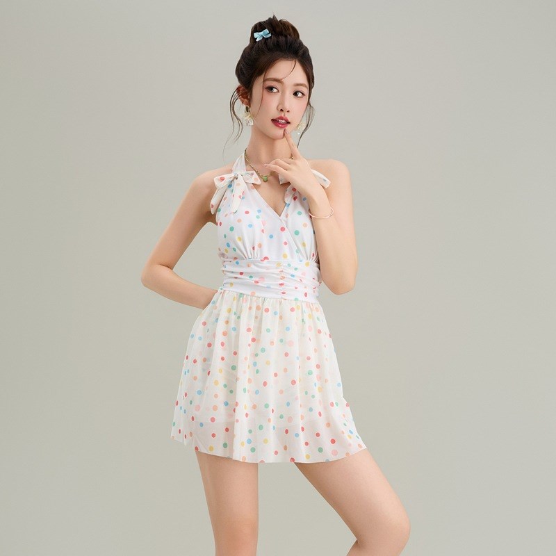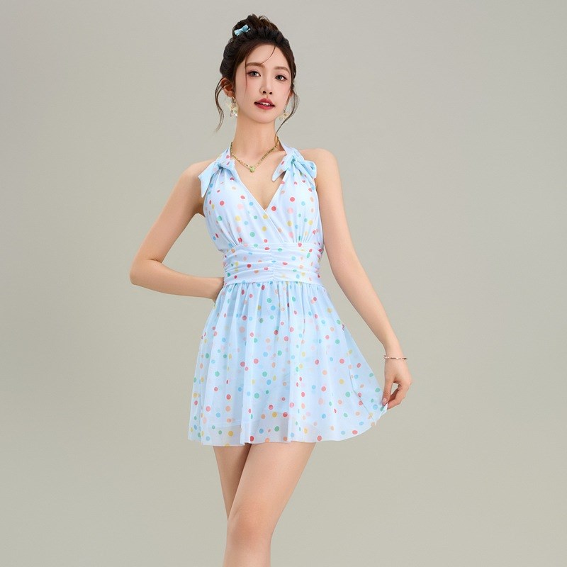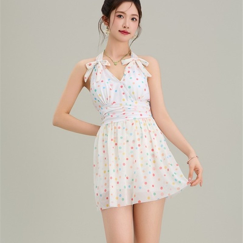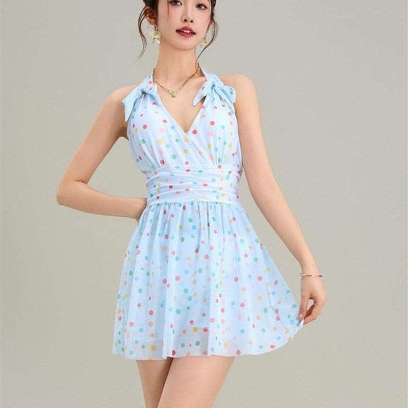 甜美风彩虹波点挂脖吊带裙女法式气质收腰显瘦中长款v领连衣裙子