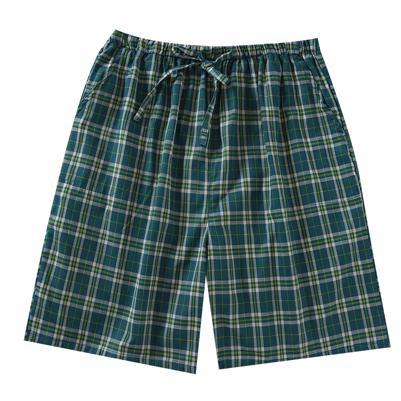 男夏纯棉短裤睡裤薄款透气纱布格子家居休闲五分沙滩裤外穿大裤衩