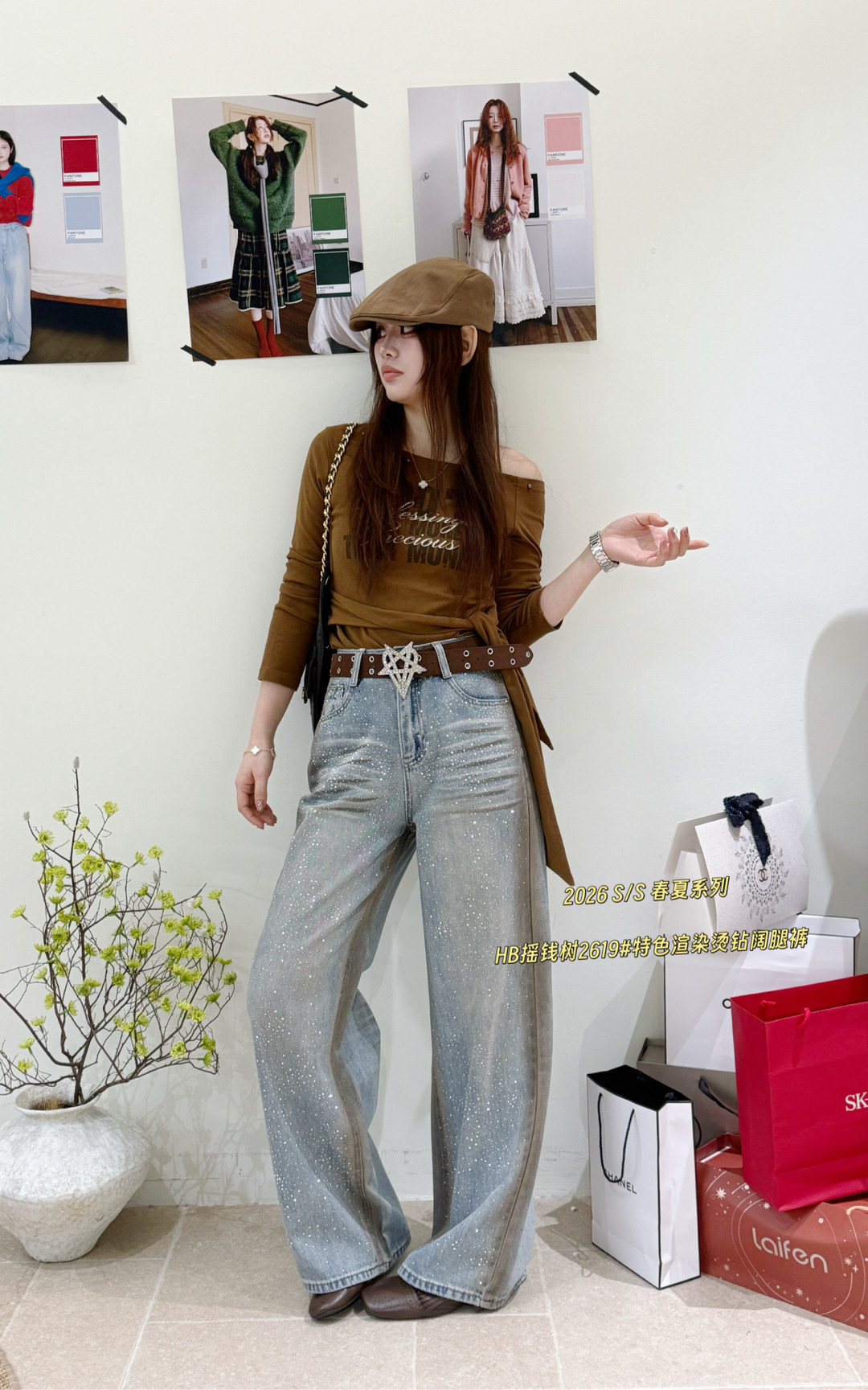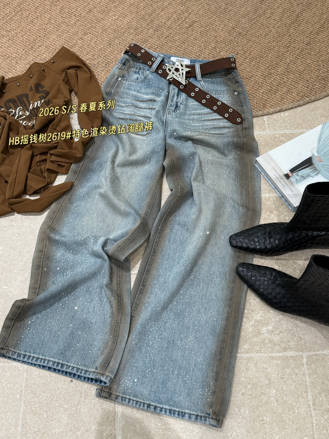 2619春季新款韩版气质百搭高腰显瘦特色渲染烫钻阔腿裤休闲牛仔裤