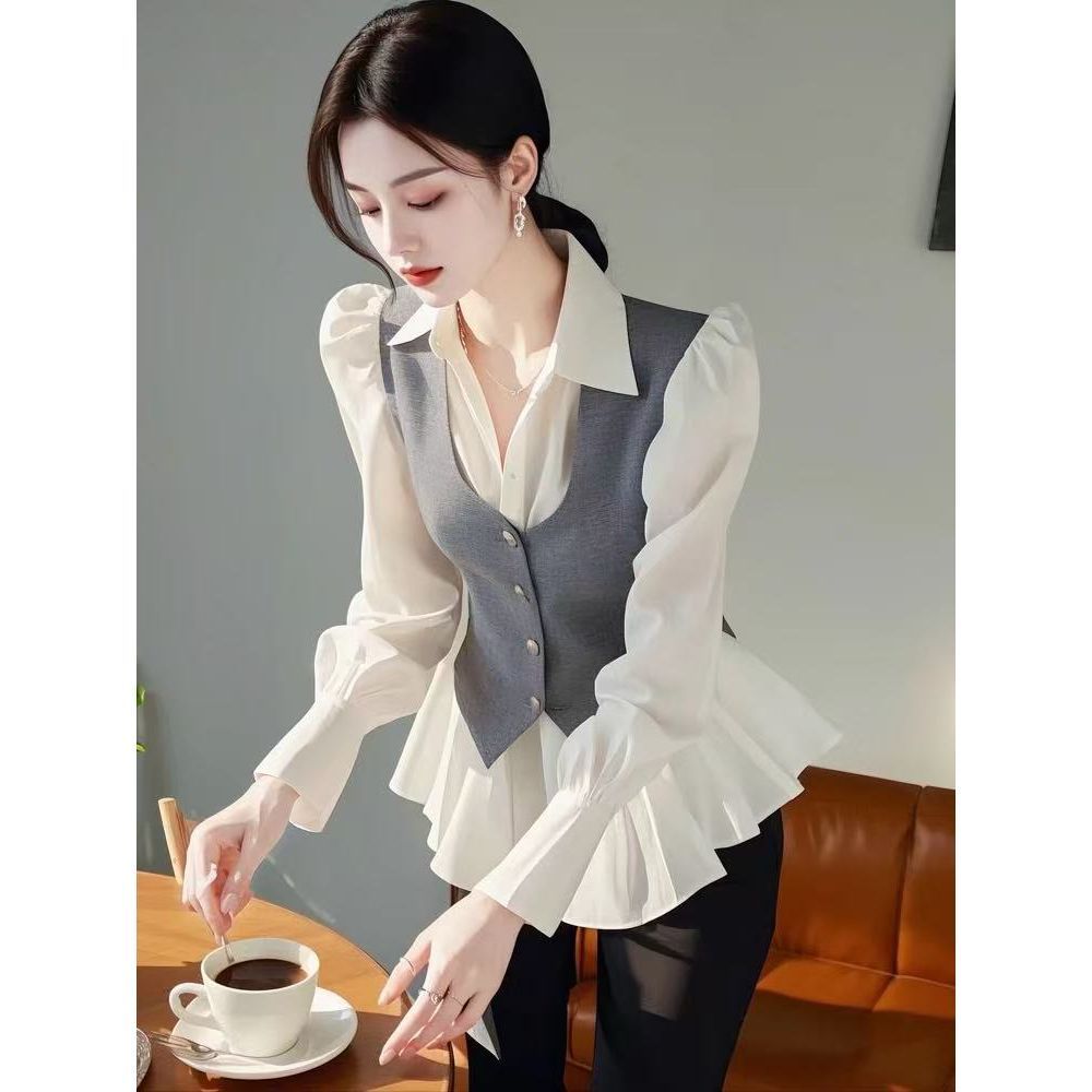 独特漂亮白色灰色拼色雪纺衬衫2025春季新款法式收腰高级感上衣女