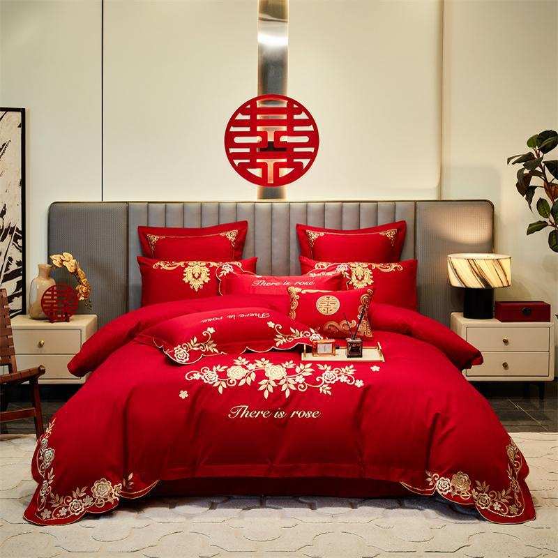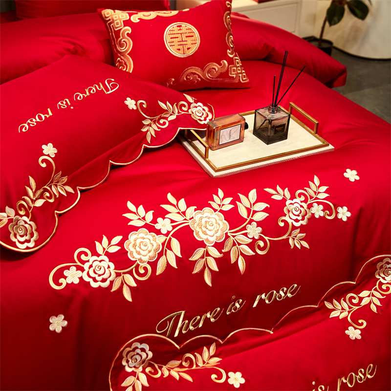 40S纯棉中式刺绣婚庆四件套结婚嫁娶喜庆床上用品床单被套
