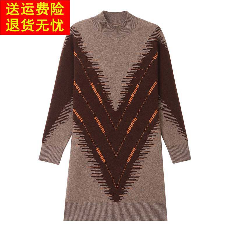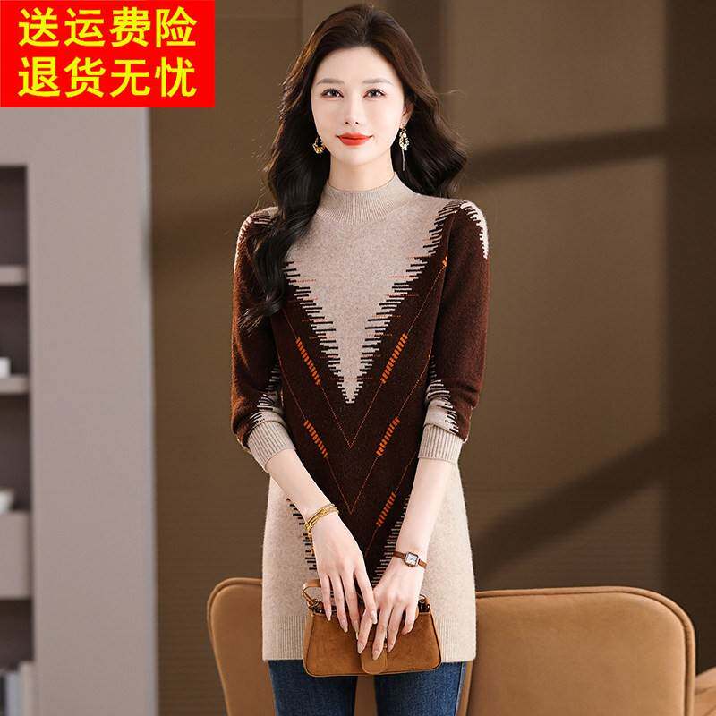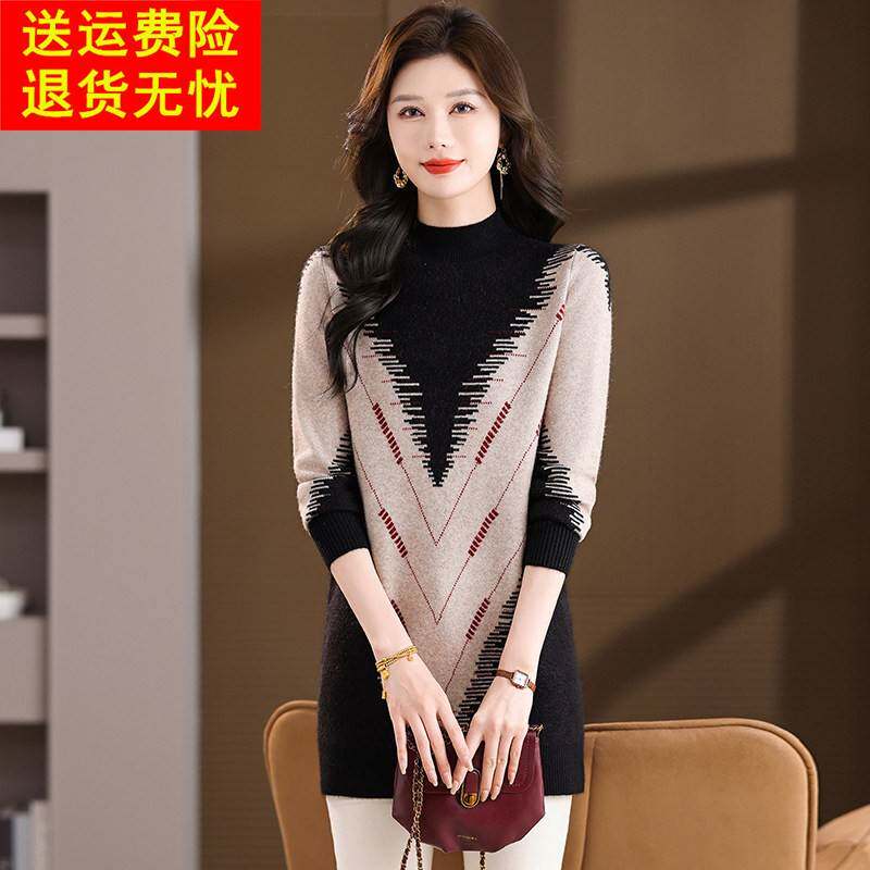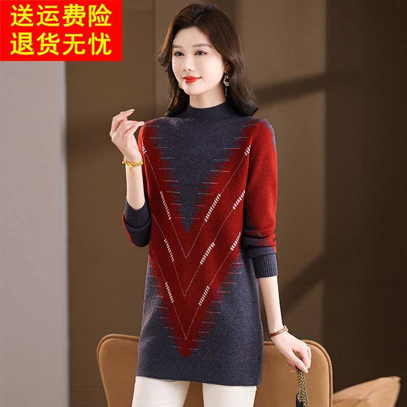 鄂尔多斯市复古撞色半高领羊毛针织衫女秋冬中长版内搭打底衫毛衣