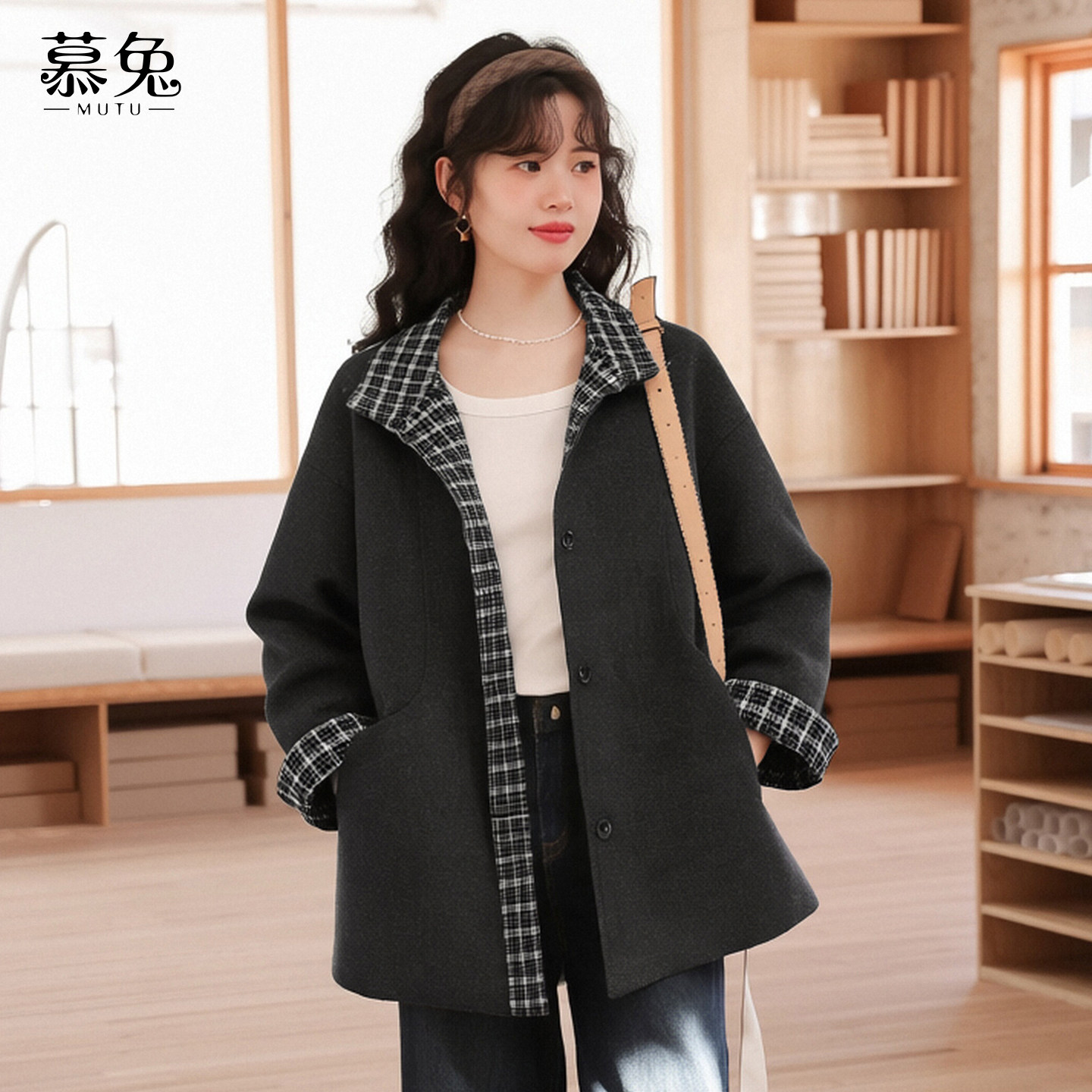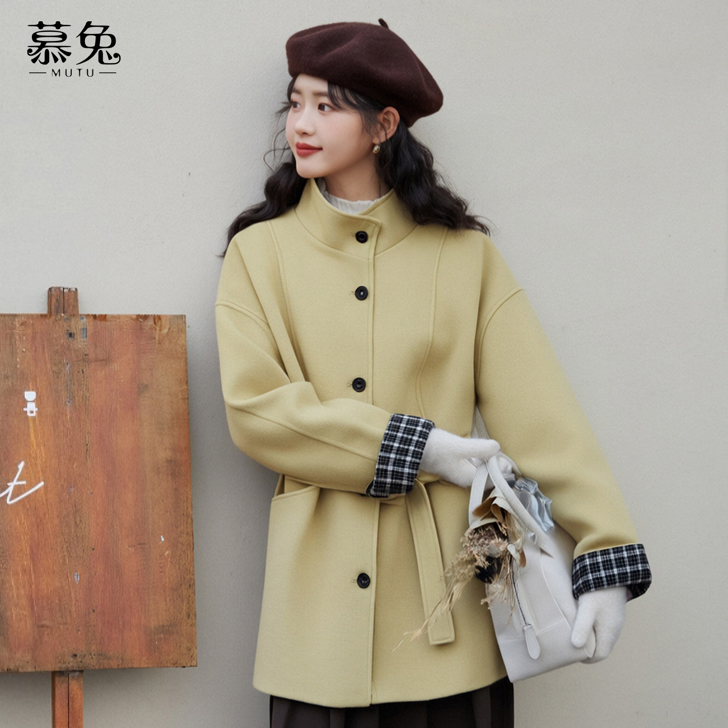 慕兔韩系拼接格纹毛呢大衣女2025冬季新款系带收腰中长款呢子外套
